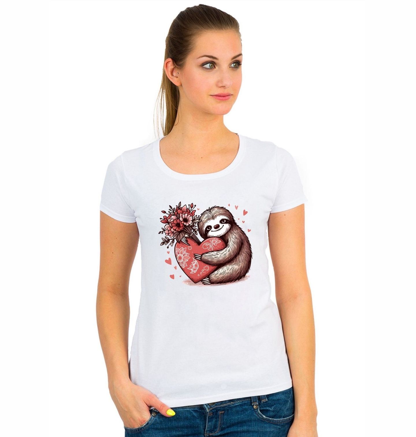 Dámské tričko Zamilovaný Lenochod se Srdcem. Tento roztomilý ilustrativní motiv zachycuje lenochoda, který s něžným úsměvem objímá velké srdce a drží květiny. Lenochod zde symbolizuje klidnou, upřímnou lásku, která nikam nespěchá, ale o to víc zahřeje u srdce. Celá kompozice působí hřejivě, láskyplně a hravě – ideální na Valentýn.