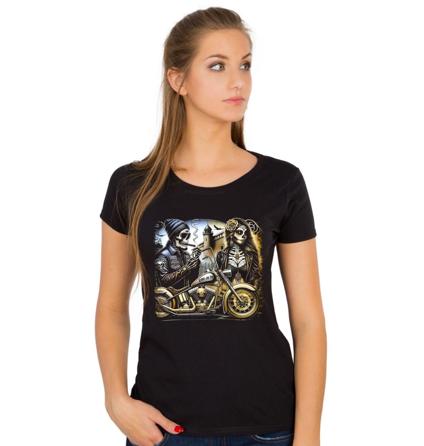 Dámské tričko Zamilovaný Motorkář Ride or Die. Stylový temný motiv, který spojuje motorkářské srdce, věrnost a lásku až za hrob. Dva kostlivci, on a ona – drsňáci v kůži, připraveni sednout na svou motorku a vyrazit vstříc věčnosti. Design je inspirovaný mexickou kulturou Día de los Muertos a streetovou estetikou – motorka, lebka a svoboda.