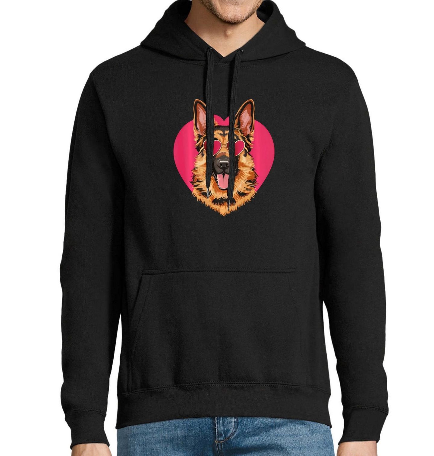 Pánská mikina Zamilovaný Německý ovčák. Německý ovčák (German Shepherd) se srdíčkovými brýlemi, který vypadá, jako by se právě bezhlavě zamiloval. Pes jako symbol věrnosti, radosti a bezpodmínečné lásky – a k tomu s dávkou humoru a stylu. Ideální dárek pro každého pejskaře.
