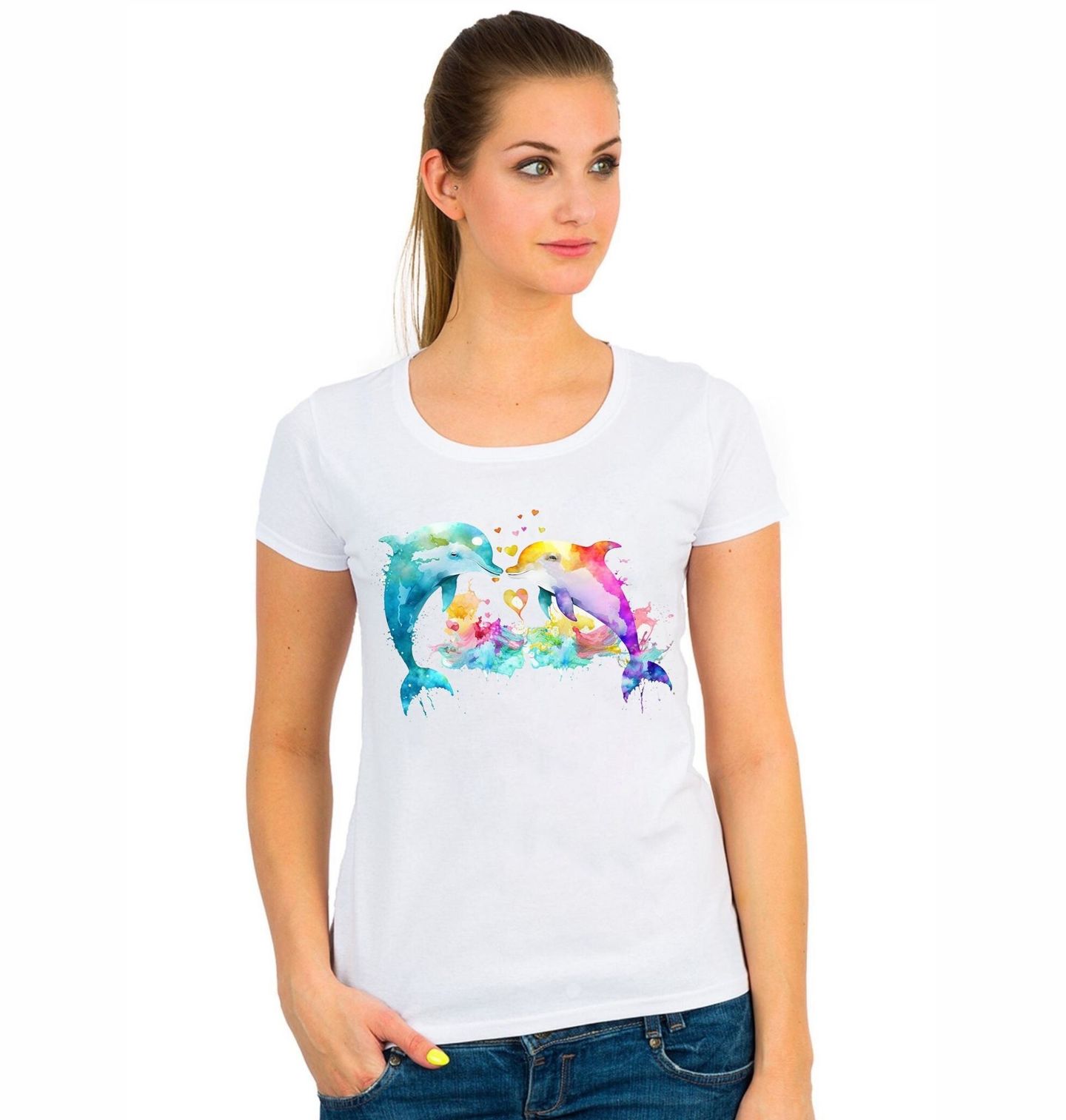 Dámské tričko Zamilovaný Pár Delfínů. Zamilovaný pár delfínů v nádherných akvarelových barvách, které připomínají letní moře. Tričko s tímto motivem je jako pohlazení po duši – ideální pro všechny milovníky oceánu, volnosti a romantiky. Ať už moře miluješ pro jeho hloubku, nebo delfína pro jeho radost ze života – tohle tričko ti bude připomínat, že láska je jako vlny: přirozená, silná a krásná.
