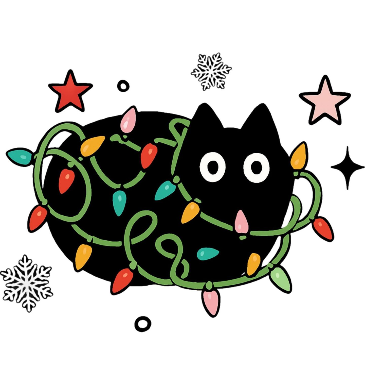 Pánské tričko Zamotaná Kočka ve Světýlkách. Roztomilá černá kočka v hlavní roli vánočního chaosu! Tato ilustrace s motivem kočky zamotané do vánočních světýlek je ideálním dárkem pro každého, kdo miluje Vánoce a kočky. Pokud máš doma kočku, která si myslí, že stromeček je jen drahá hračka – tenhle design tě vystihne.