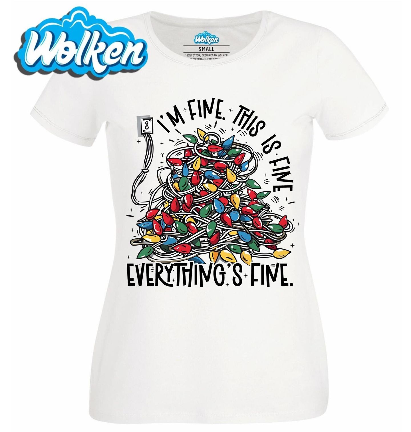 Dámské tričko Zamotaná Vánoční Světýlka. Vánoce v chaosu – vtipný motiv pro každého, kdo letos zase rozmotává světýlka. Tenhle motiv mluví za všechno – změť vánočních světýlek a ironický nápis: „I’m fine. This is fine. Everything’s fine.“ („Jsem v pohodě. Tohle je v pohodě. Všechno je v pohodě.“)