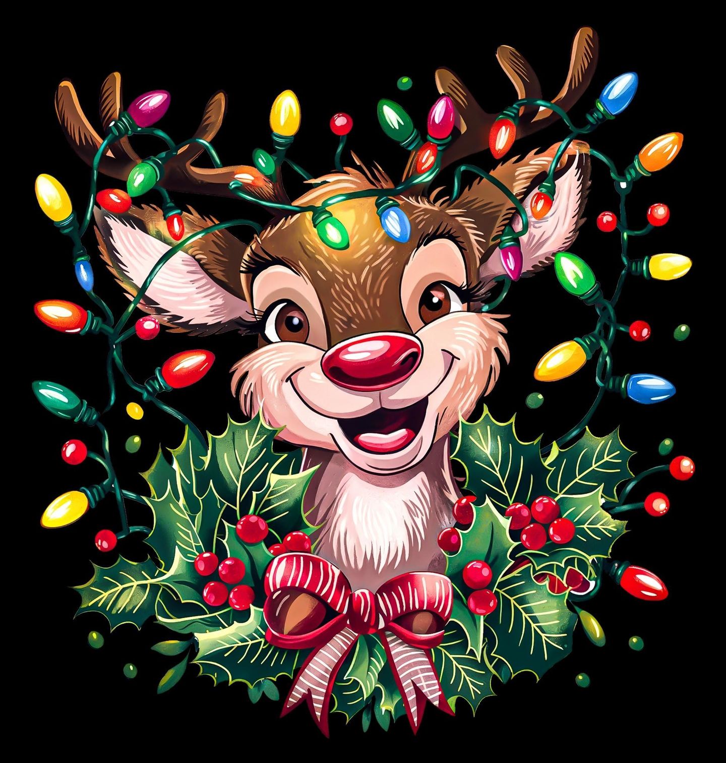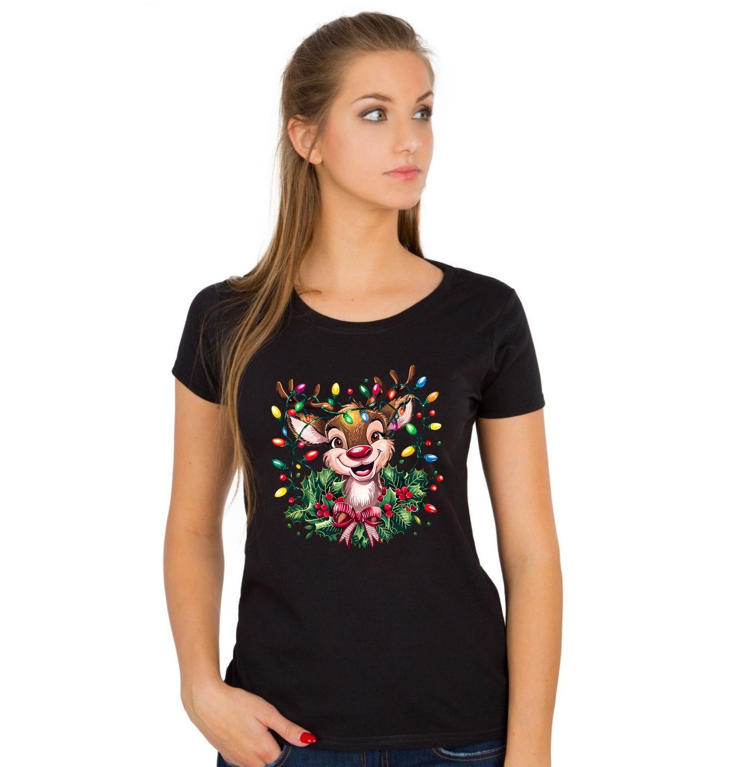 Dámské tričko Zamotaný Sob ve Světýlkách. Rozzářený motiv, který roztaje každé srdce – usměvavý sob s červeným nosem omotaný barevnými světýlky je ideálním symbolem radosti, kterou Vánoce přinášejí. Sob je obklopen cesmínou, mašlí a vánoční atmosférou, která z něj dělá dokonalý sváteční motiv.