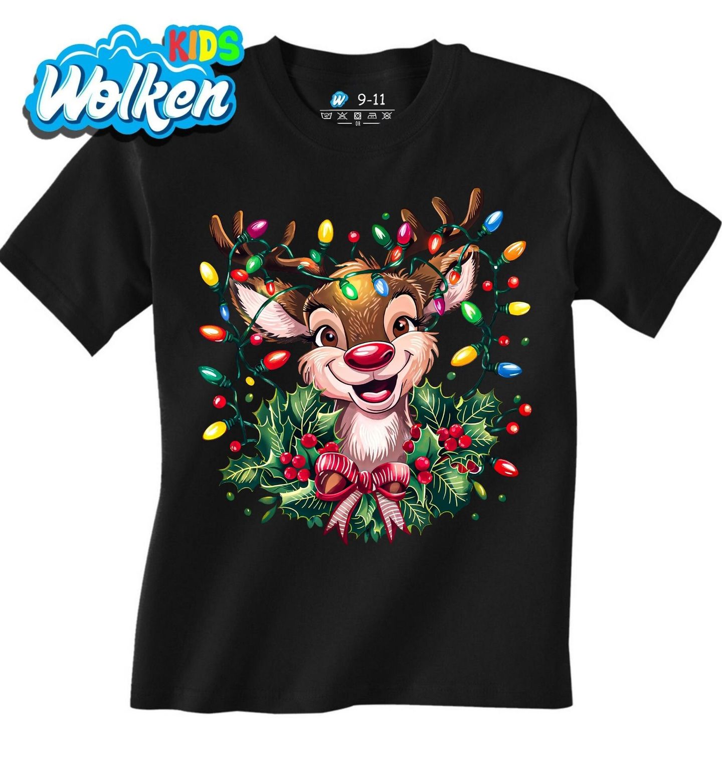 Dětské tričko Zamotaný Sob ve Světýlkách. Rozzářený motiv, který roztaje každé srdce – usměvavý sob s červeným nosem omotaný barevnými světýlky je ideálním symbolem radosti, kterou Vánoce přinášejí. Sob je obklopen cesmínou, mašlí a vánoční atmosférou, která z něj dělá dokonalý sváteční motiv.
