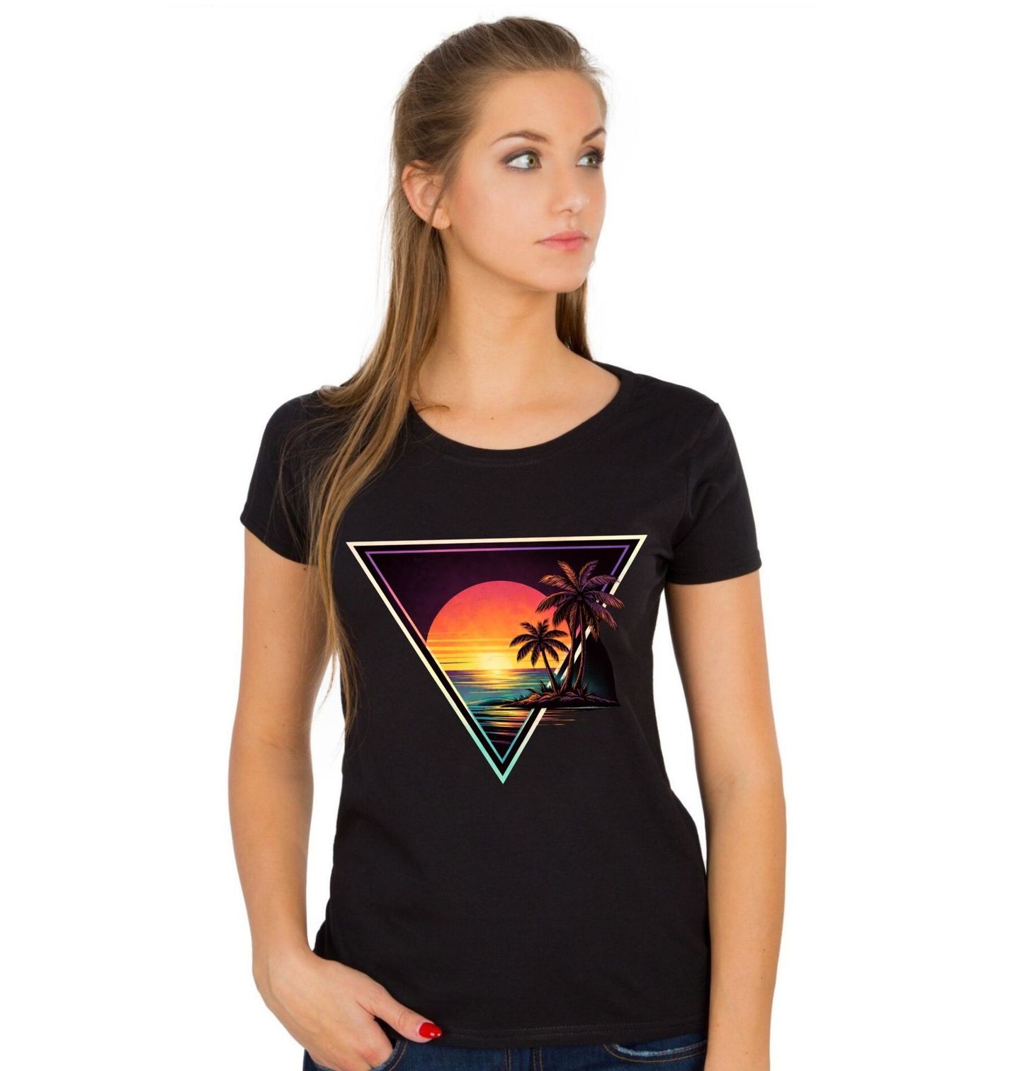 Dámské tričko Západ Slunce s Palmami. Působivý retro design zobrazující západ slunce nad mořem s palmami, zasazený do geometrického trojúhelníku s neonovým rámem. Teplé odstíny oranžové, růžové a fialové vytvářejí atmosféru letního večera a klidu. Tento motiv evokuje dovolenou, relax a svobodu, ideální pro milovníky tropických destinací.