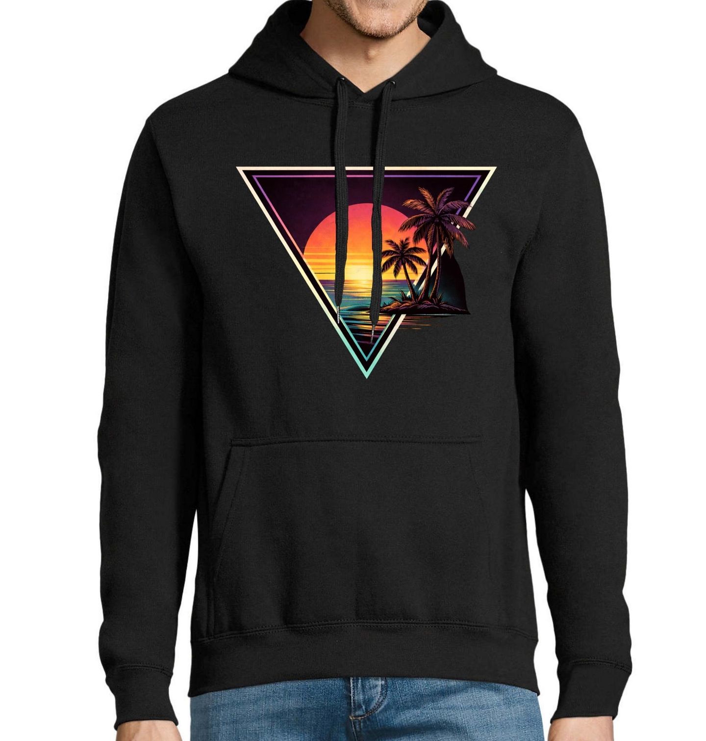 Pánská mikina Západ Slunce s Palmami. Působivý retro design zobrazující západ slunce nad mořem s palmami, zasazený do geometrického trojúhelníku s neonovým rámem. Teplé odstíny oranžové, růžové a fialové vytvářejí atmosféru letního večera a klidu. Tento motiv evokuje dovolenou, relax a svobodu, ideální pro milovníky tropických destinací.