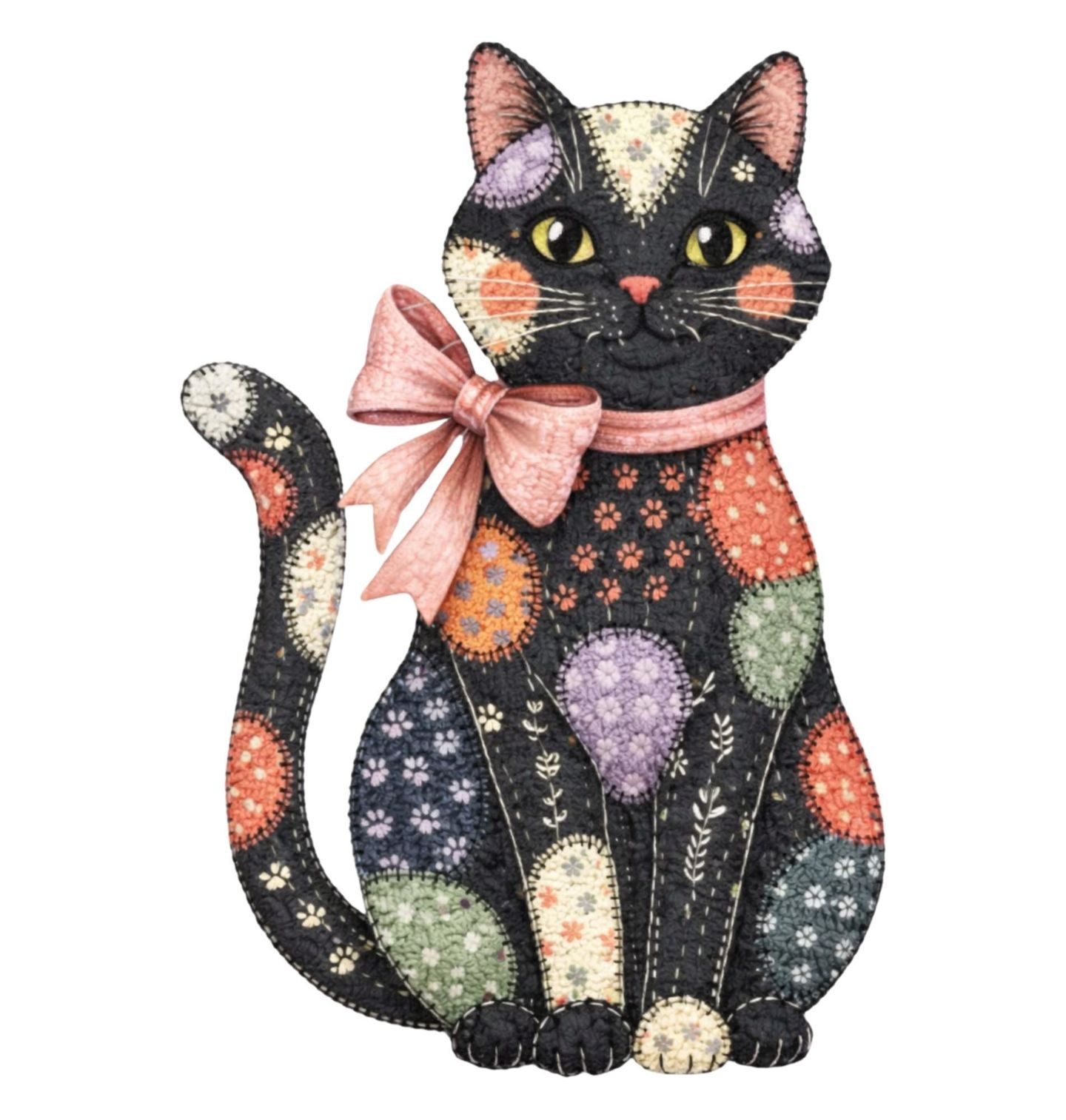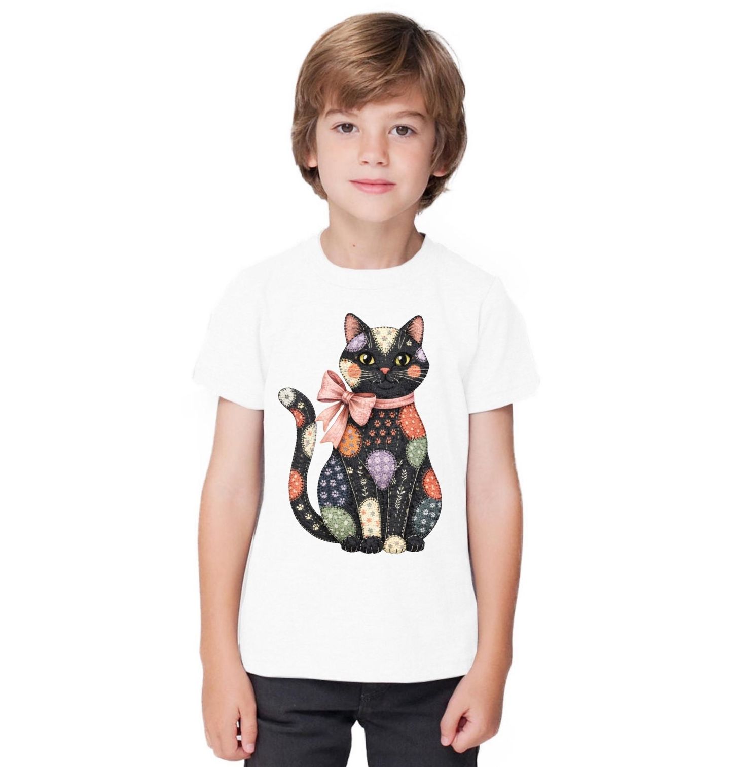Dětské tričko Záplatovaná Kočka s Mašlí. Elegantní mašle kolem krku dodává celé ilustraci něžný a hravý nádech. Kočka v tomto provedení působí jako malý umělecký kousek – každý detail připomíná ruční práci a pečlivě skládá dohromady harmonii barev a tvarů. Tento motiv je ideální pro všechny, kteří mají rádi kreativitu, originalitu a jedinečný styl.