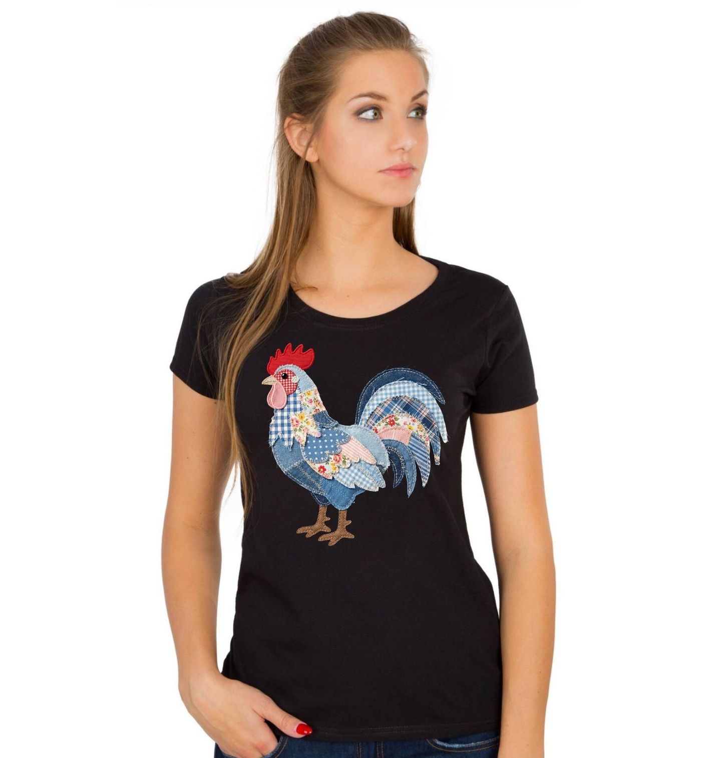 Dámské tričko Zaplátovaný Kohout Folk. Slepice je zpracovaná jako patchwork, takže každý detail působí autenticky a hravě, jako by pocházela přímo z prostředí farma. Tento design spojuje folk estetiku s moderním grafickým zpracováním a je ideální pro milovníky venkova, textilních motivů a originálních ilustrací.