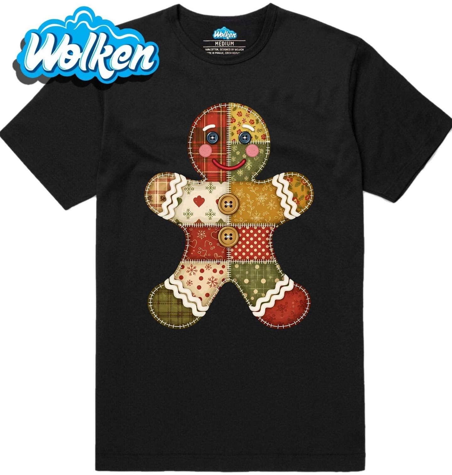 Pánské tričko Záplatovaný Vánoční Perníček. Vánoce jsou časem radosti, tradic a... patchworkových perníčků! Tento rozkošný motiv zobrazuje veselého perníčkového panáčka poskládaného z barevných záplat v tradičních vánočních barvách. Jeho knoflíky, růžové tvářičky a úsměv vás okamžitě naladí na sváteční notu.