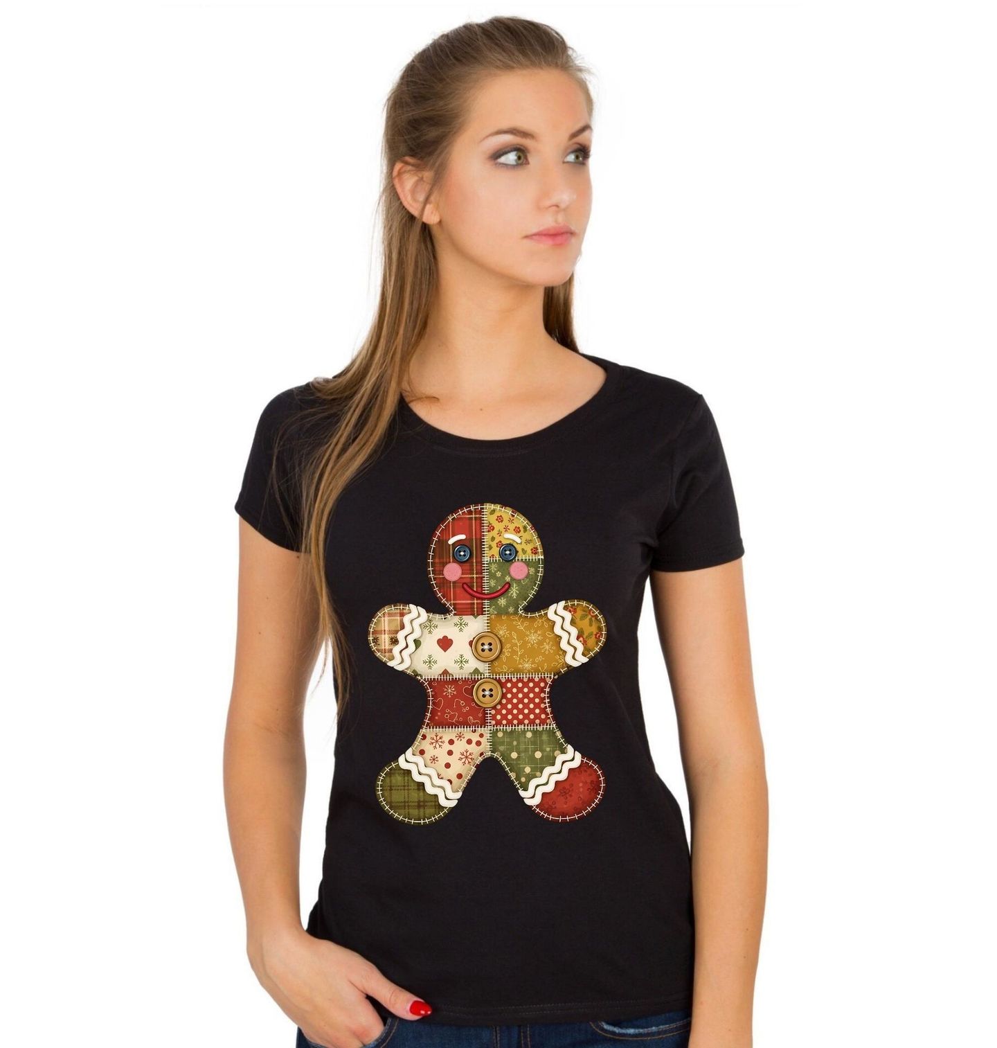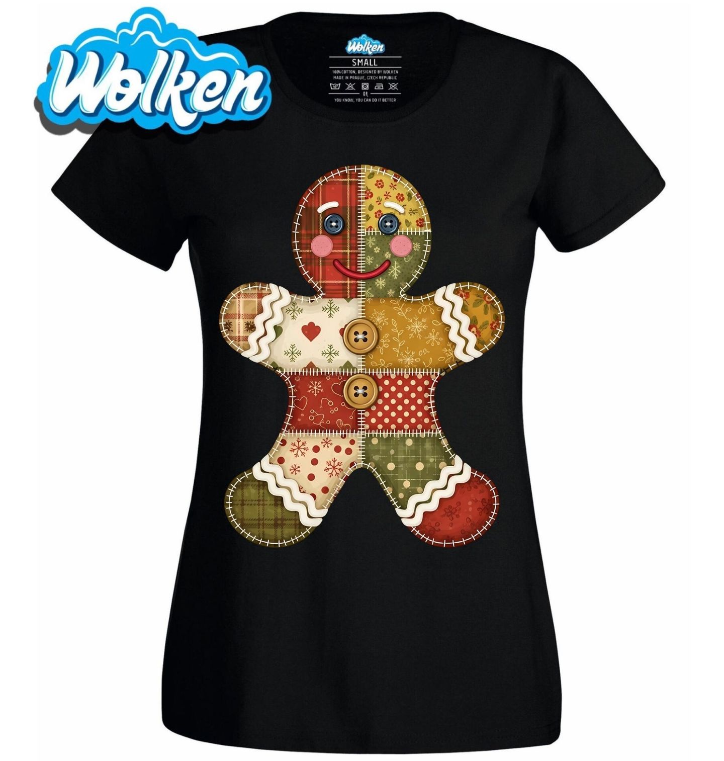 Dámské tričko Záplatovaný Vánoční Perníček. Vánoce jsou časem radosti, tradic a... patchworkových perníčků! Tento rozkošný motiv zobrazuje veselého perníčkového panáčka poskládaného z barevných záplat v tradičních vánočních barvách. Jeho knoflíky, růžové tvářičky a úsměv vás okamžitě naladí na sváteční notu.