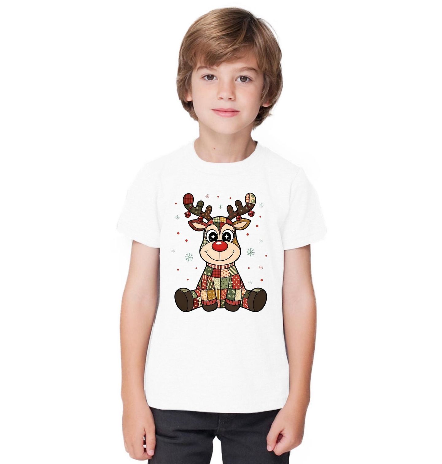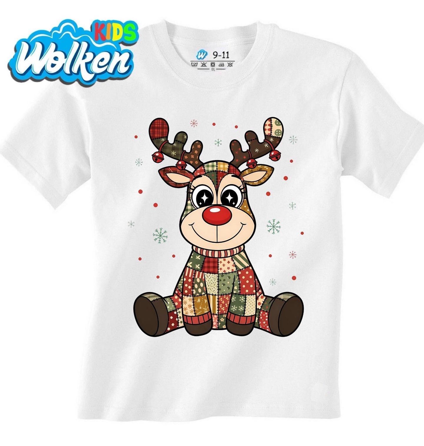 Dětské tričko Zaplátovaný Vánoční Sobík. Vánoce bez soba? Nemyslitelné! Tento rozkošný motiv veselého soba v patchworkovém svetru přináší tu pravou sváteční náladu s dávkou roztomilosti. Ideální pro děti i dospělé, kteří milují originální a vtipné vánoční motivy.