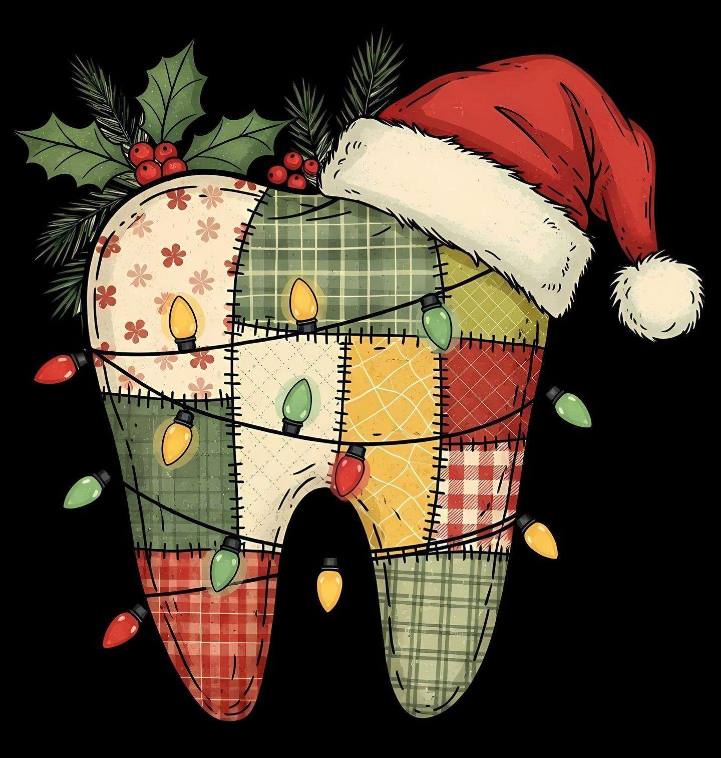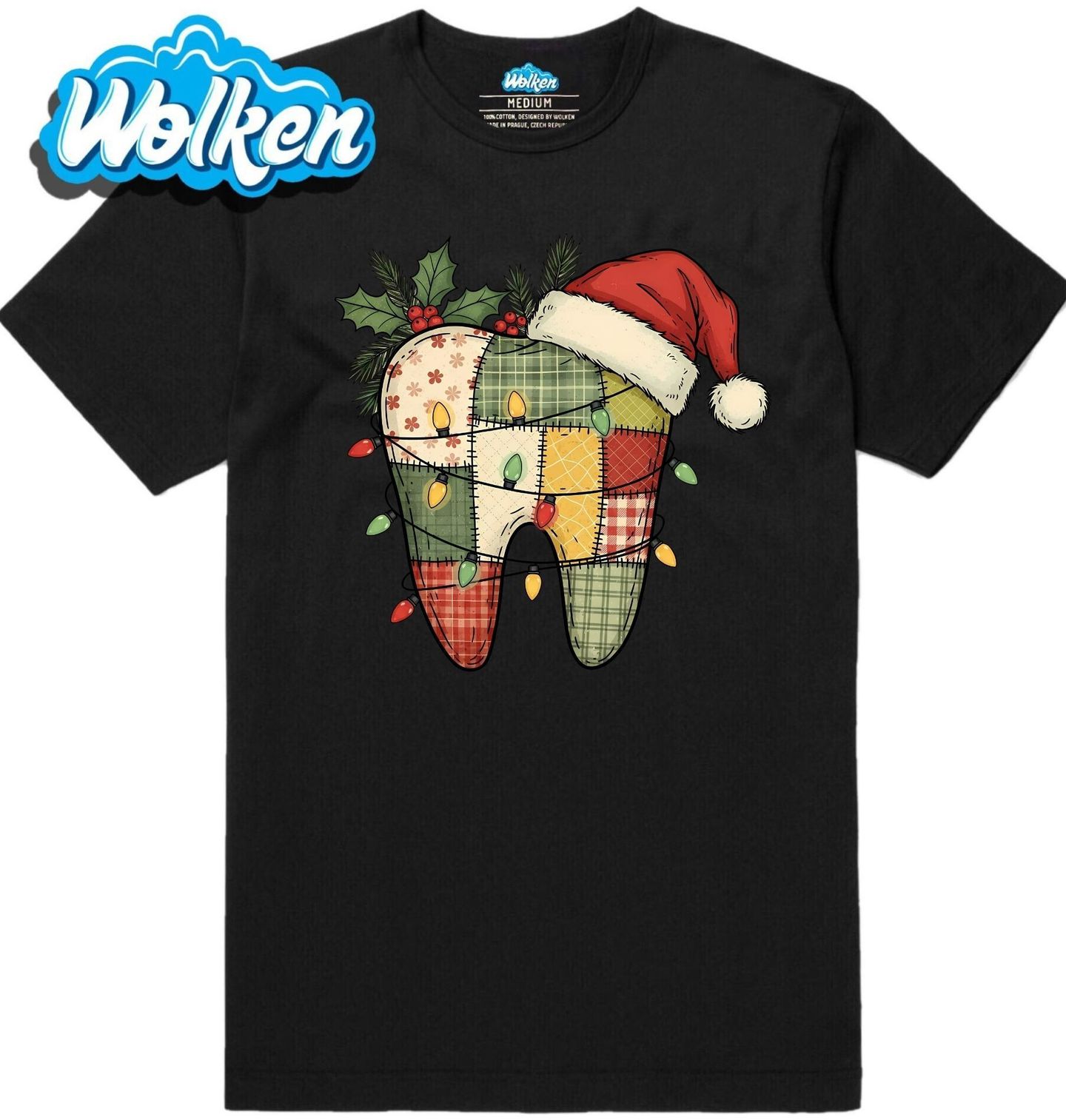 Pánské tričko Záplatovaný Vánoční Zub. Vánoce s úsměvem a kapkou originality! Stylový motiv veselého zubu z barevných patchworkových látek ozdobený vánoční čepicí, světýlky a cesmínou je perfektní volbou pro každého zubaře, dentální hygienistku nebo milovníka úsměvů.