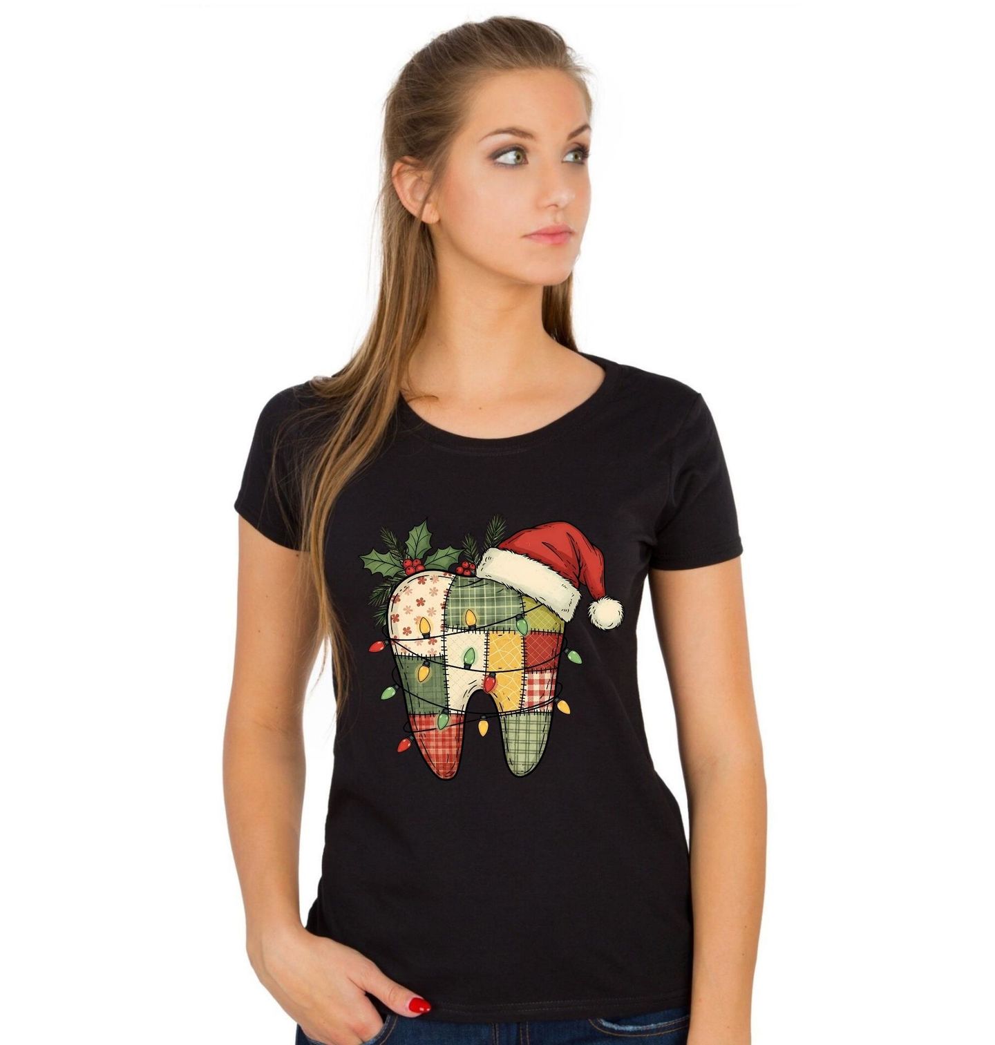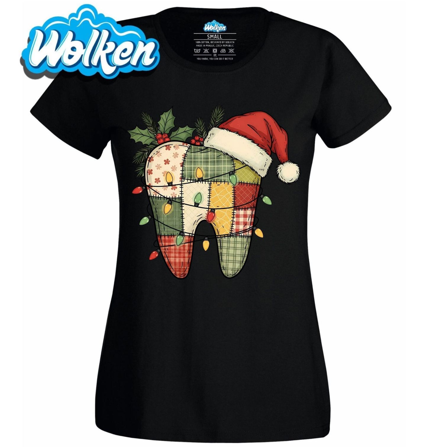 Dámské tričko Záplatovaný Vánoční Zub. Vánoce s úsměvem a kapkou originality! Stylový motiv veselého zubu z barevných patchworkových látek ozdobený vánoční čepicí, světýlky a cesmínou je perfektní volbou pro každého zubaře, dentální hygienistku nebo milovníka úsměvů.