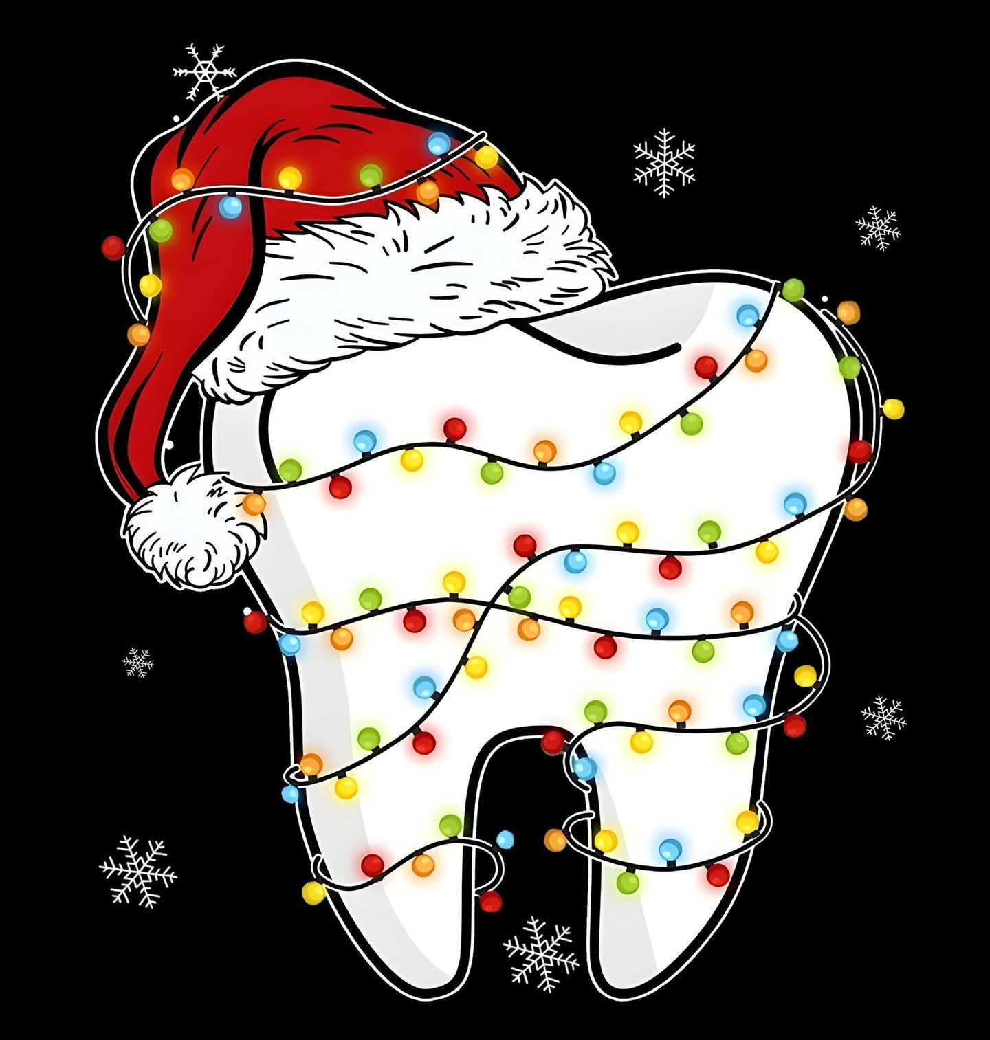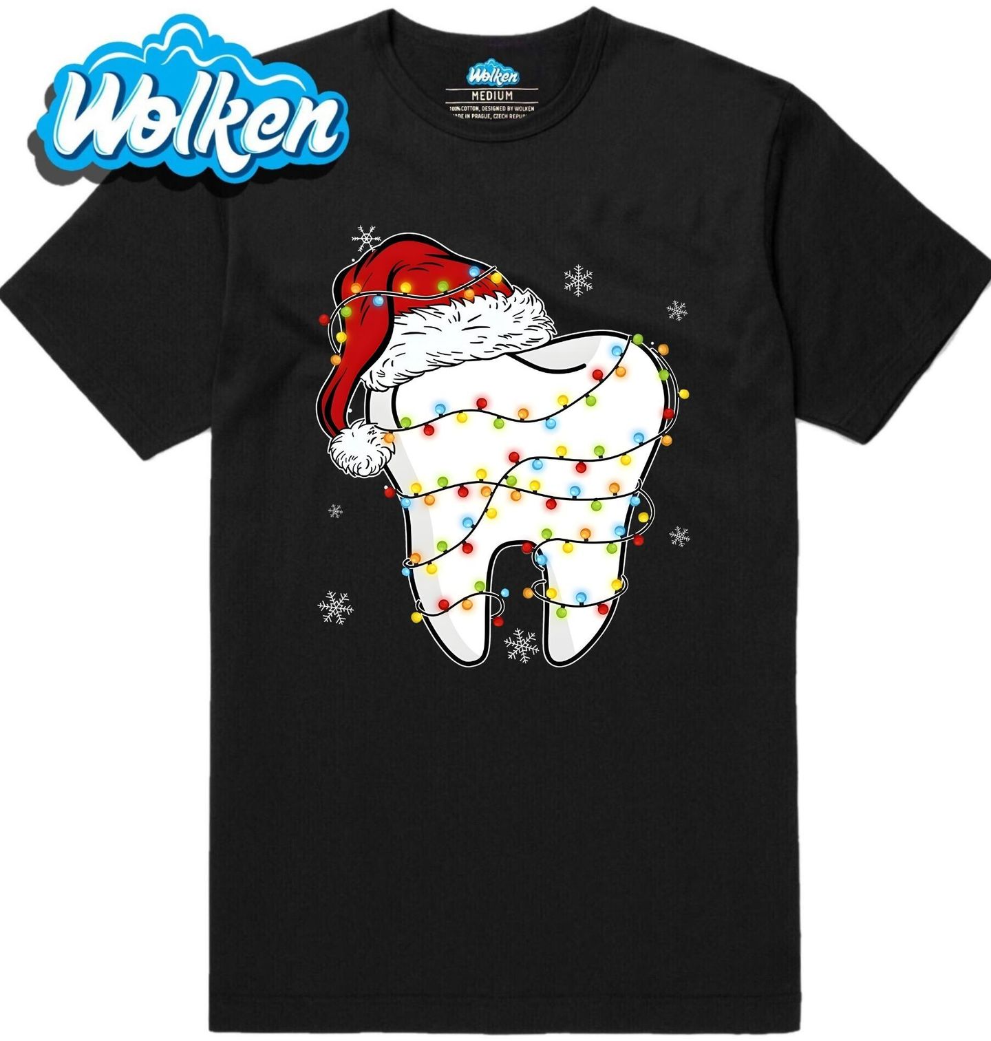 Pánské tričko Zářivý Vánoční Zub. Vánoce mohou být sladké i v zubařském stylu! Velká bílá stolička ozdobená klasickými vánočními světýlky a červenou čepicí Santa Clause. Ideální dárek pro každého zubaře, hygienistku, zubní sestru nebo nadšence do dentální péče.