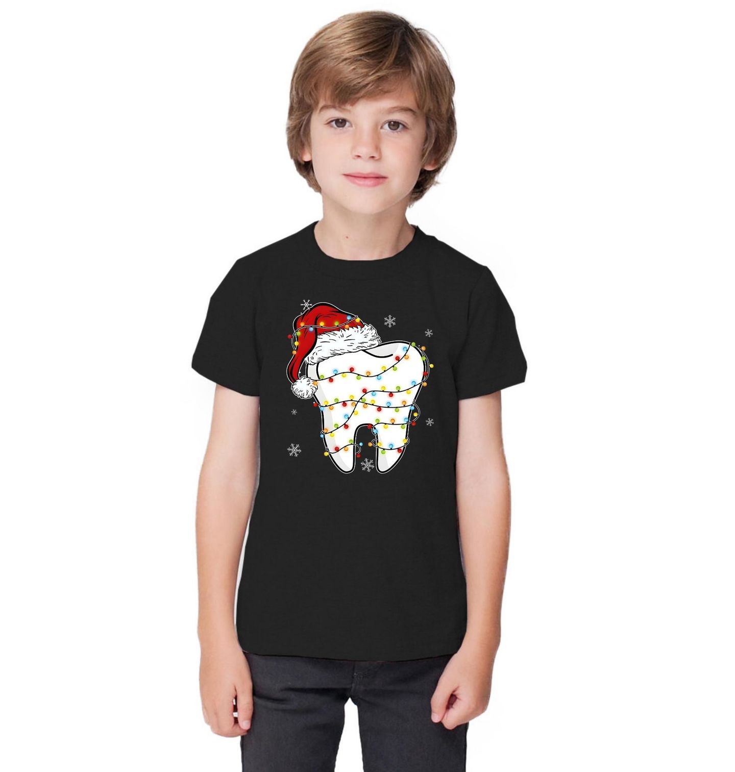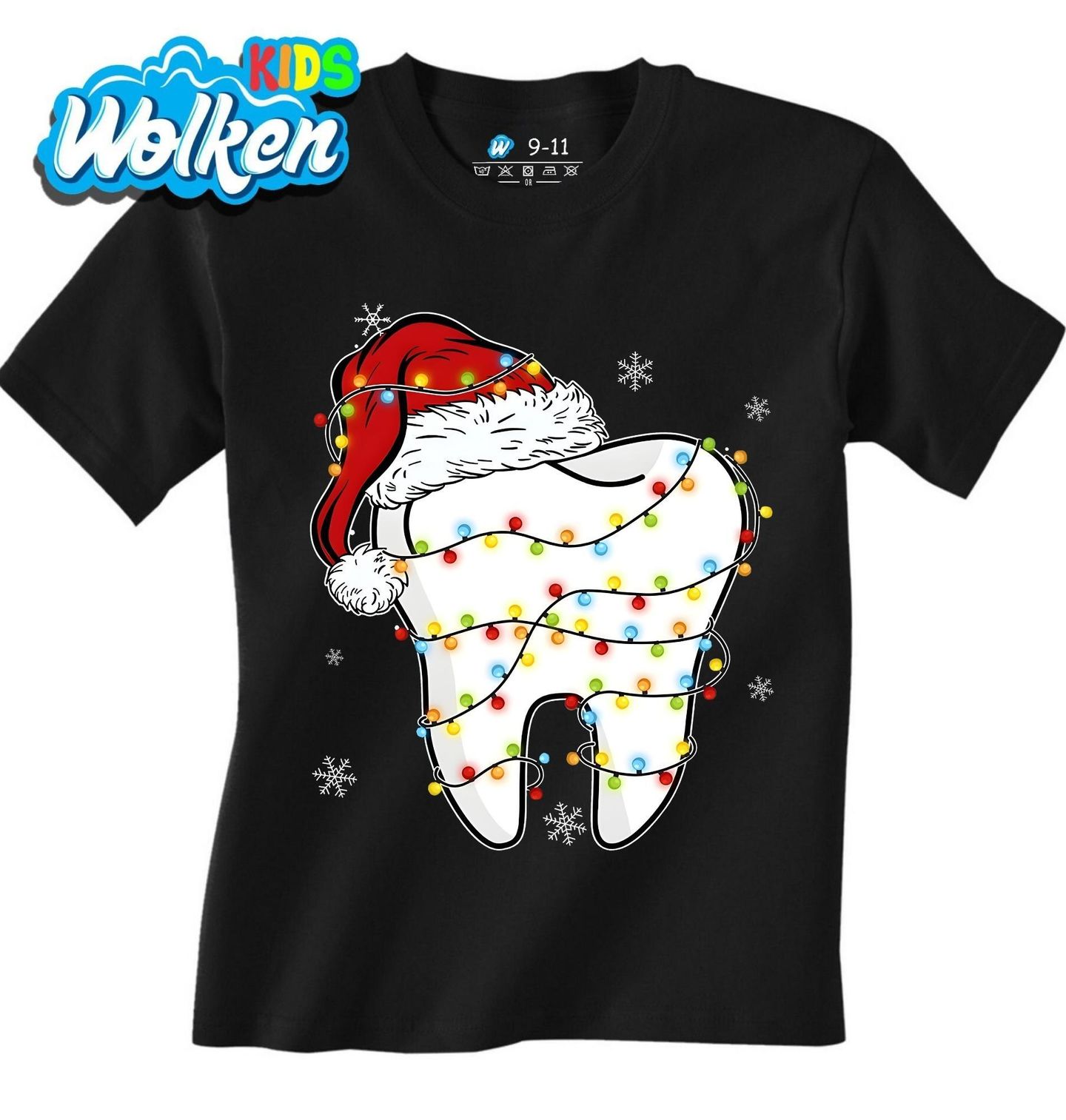 Dětské tričko Zářivý Vánoční Zub. Vánoce mohou být sladké i v zubařském stylu! Velká bílá stolička ozdobená klasickými vánočními světýlky a červenou čepicí Santa Clause. Ideální dárek pro každého zubaře, hygienistku, zubní sestru nebo nadšence do dentální péče.