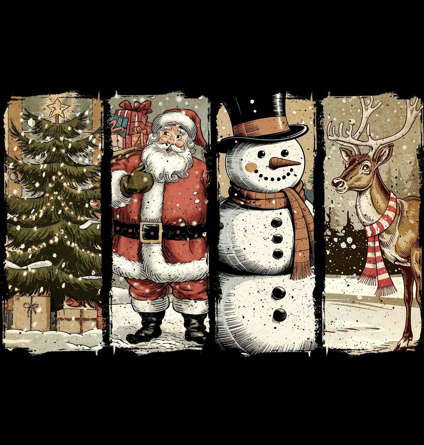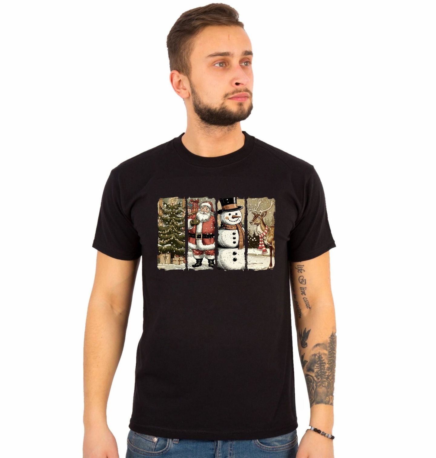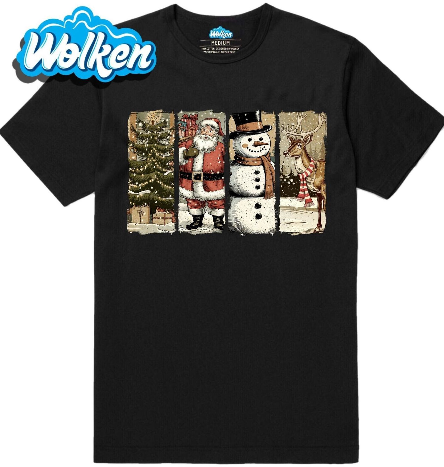 Pánské tričko Zasněžená Vánoční Noc. Vneste do svého domova pravé sváteční kouzlo s tímto krásným motivem Vánoce v polyptychu, který spojuje vše, co máme na Vánocích rádi – santa, sněhulák, vánoční stromek a jelen. Každý panel zachycuje jednu z ikonických postav, jako by vyprávěl vlastní zimní příběh.