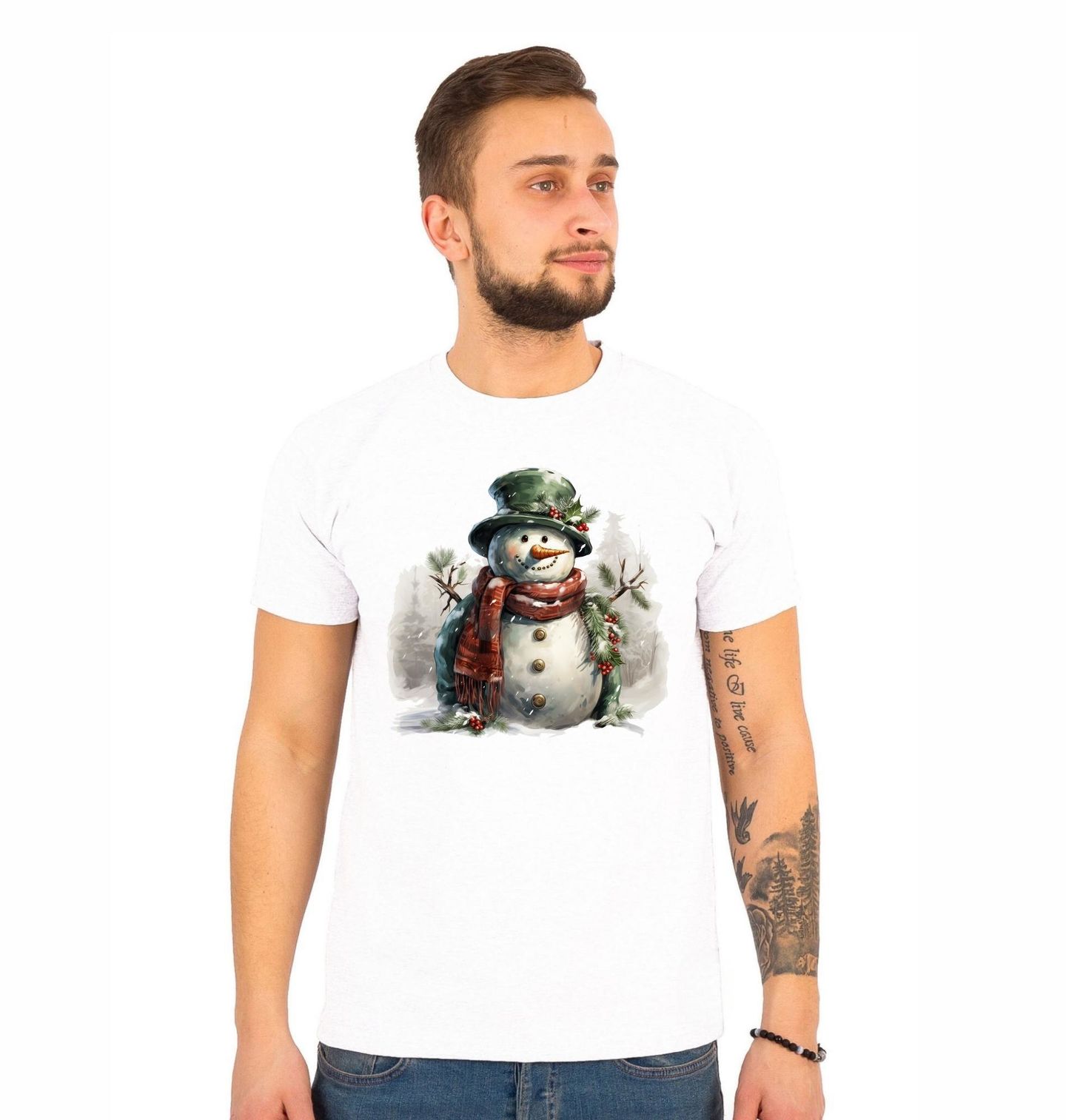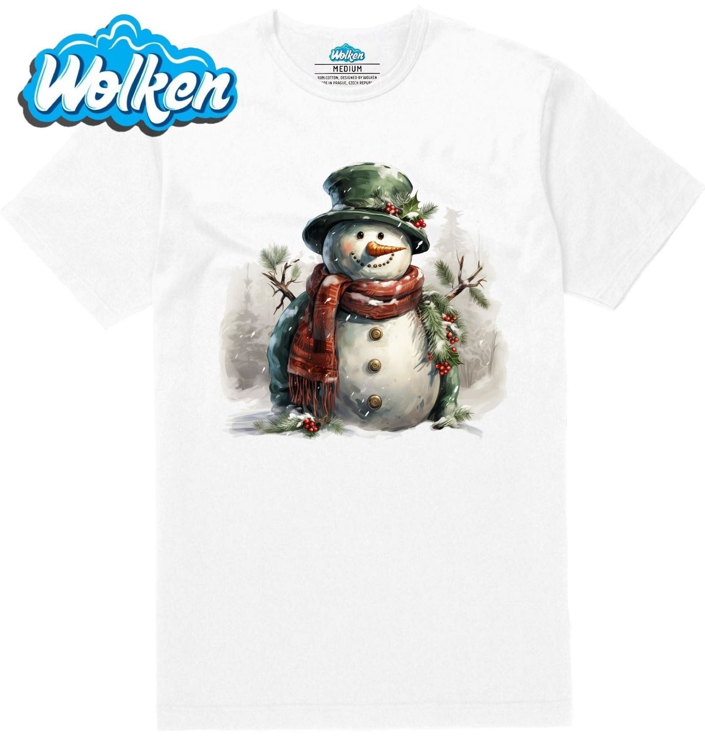 Pánské tričko Zasněžený Vánoční Sněhulák. Elegantní zelený klobouk, červená šála a dekorace z cesmíny dělají z tohoto sněhuláka stylového parťáka pro vaše Vánoce. Ať už hledáte originální vánoční dárek nebo jen chcete ozdobit svůj šatník či interiér, motiv sněhuláka je neodolatelnou volbou pro všechny, kdo milují Vánoce, sníh a pohodu.