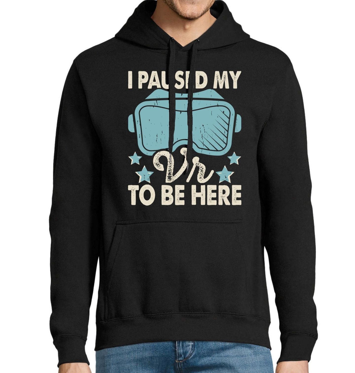 Pánská mikina Zastavil jsem svou virtuální realitu, abych tu byl. „I paused my VR to be here“. Tento motiv s vtipným sdělením zachycuje svět digitální zábavy a moderních technologií. Dominuje mu stylová ilustrace vr brýle, které symbolizují virtuální realita a únik do digitálních světů. Text jasně odkazuje na videohry, hraní a životní styl, který je blízký každému, kdo se považuje za gamera.