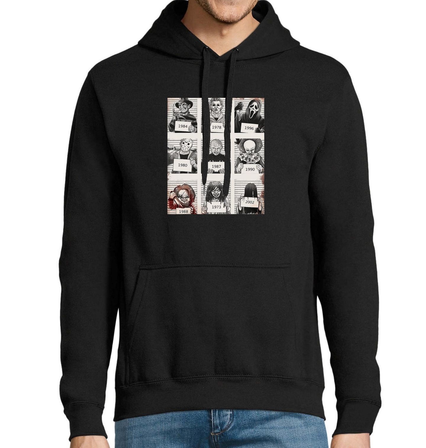 Pánská mikina Zatčení Zabijáci Busted. Zatčeno! Všichni tvoji oblíbení hororoví zabijáci skončili na jedné policejní nástěnce s rokem „narození“ své první filmové noční můry. Poznáš je všechny? Najdeš tu legendy jako: Freddy Krueger, Michael Myers, Ghostface, Jason Voorhees, Pinhead, Pennywise, Chucky, Regan, Samara.