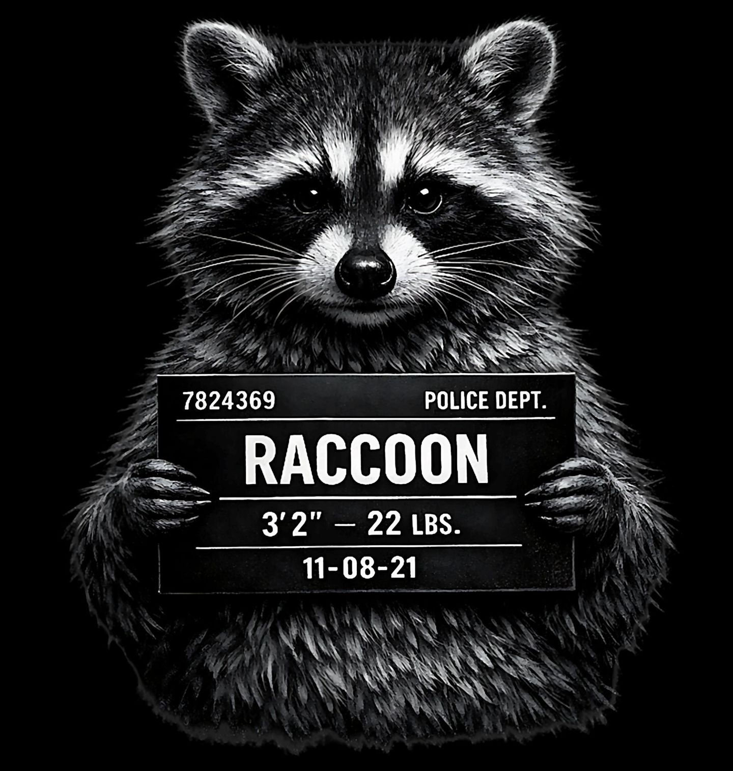 Dětské tričko Zatčený Mýval Busted. Vtipný design zobrazující mývala s policejní cedulkou „RACCOON“ (mýval), včetně údajů jako výška, váha a datum. Tento design působí jako humorná „mugshot“ fotografie a skvěle vystihuje rošťáckou povahu tohoto zvířete. Ideální pro všechny, kdo mají rádi zvířata a humor.