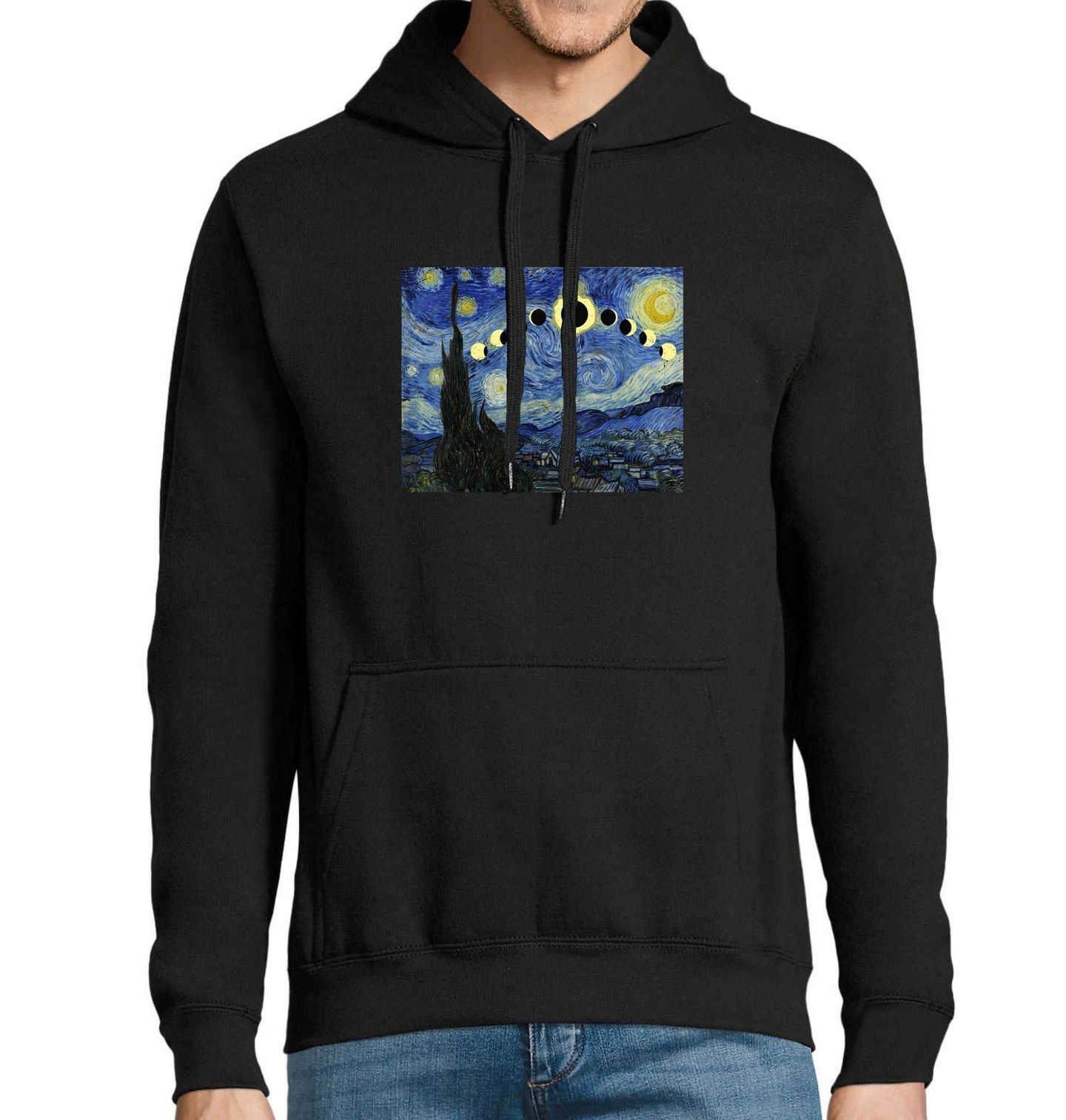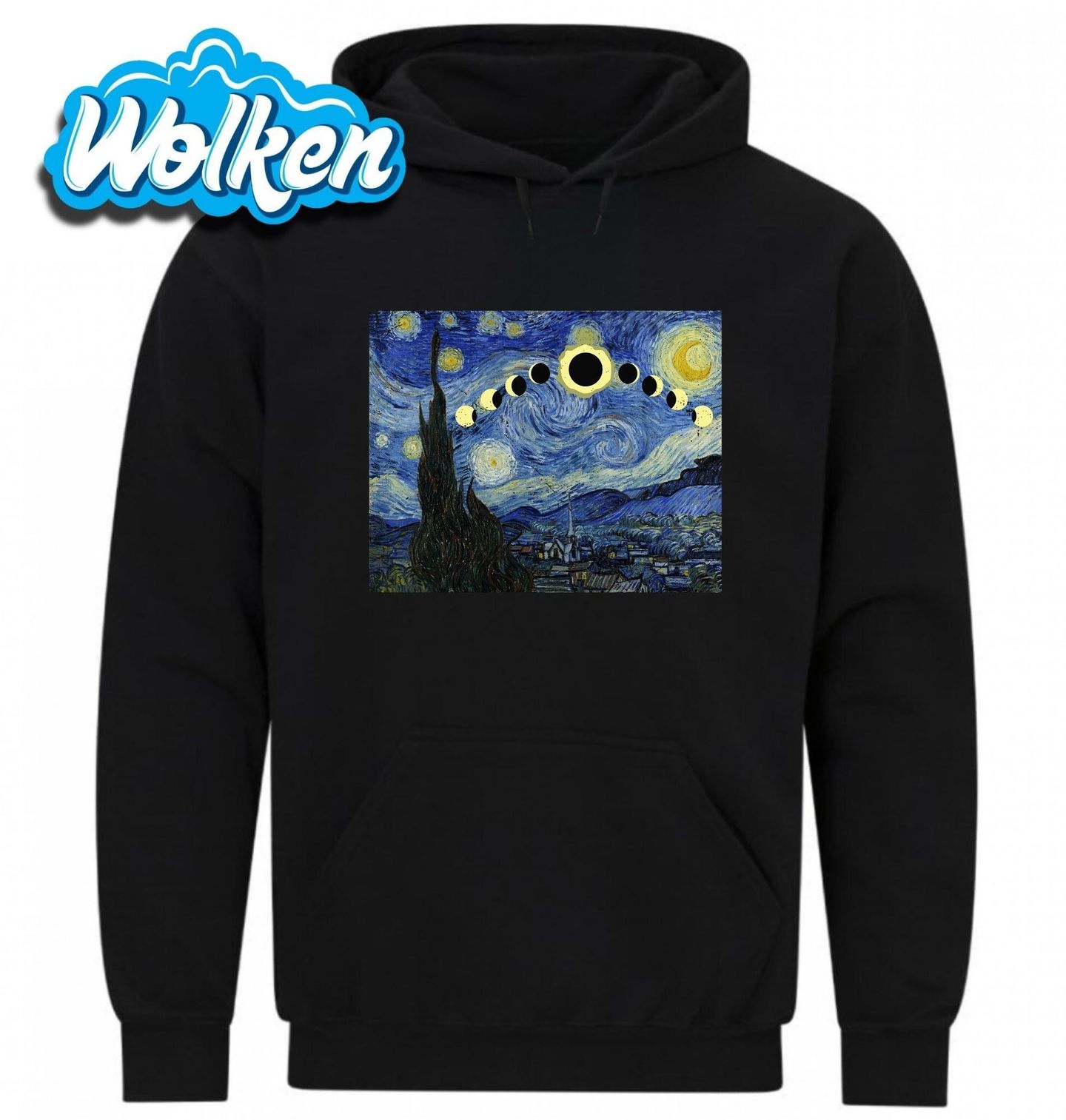 Pánská mikina Zatmění Slunce ve Hvězdné noci. Spojení ikonického obrazu Hvězdná noc od Vincenta van Gogha a poetického průběhu zatmění Slunce. Vidíme zde postupné fáze přechodu Měsíce před Sluncem – od částečného až po úplné zatmění (tzv. totalitu), kdy Slunce zcela zakrývá Měsíc a vytváří temný kotouč s korónou.