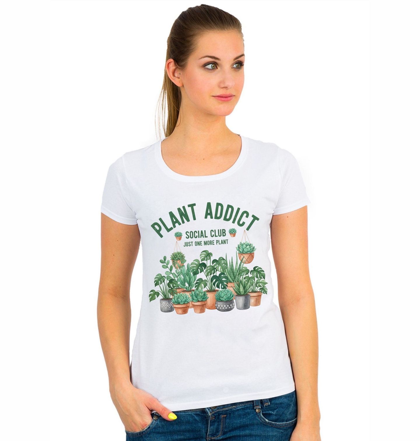 Dámské tričko Závislý na Rostlinách Plant Addict. Design s textem „PLANT ADDICT SOCIAL CLUB – JUST ONE MORE PLANT“ (Klub milovníků rostlin – ještě jednu rostlinu) je perfektní pro všechny nadšence do pěstování. Motiv různých pokojových rostlin vytváří příjemnou přírodní atmosféru. Ideální pro každého, kdo miluje rostliny, pokojovky a gardening lifestyle.