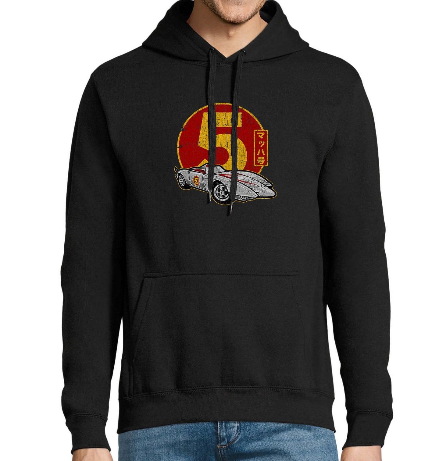 Pánská mikina Závodní Auto Speed Racer Mach 5. Legendární auto s číslem 5 v ikonickém retro provedení přináší nádech nostalgie a stylu 80.–90. let. Tento potisk je inspirován japonskou anime klasikou Mach GoGoGo, známou pod názvem Speed Racer, kde hlavní roli hraje právě závodní vůz s číslem 5 – Mach 5.
