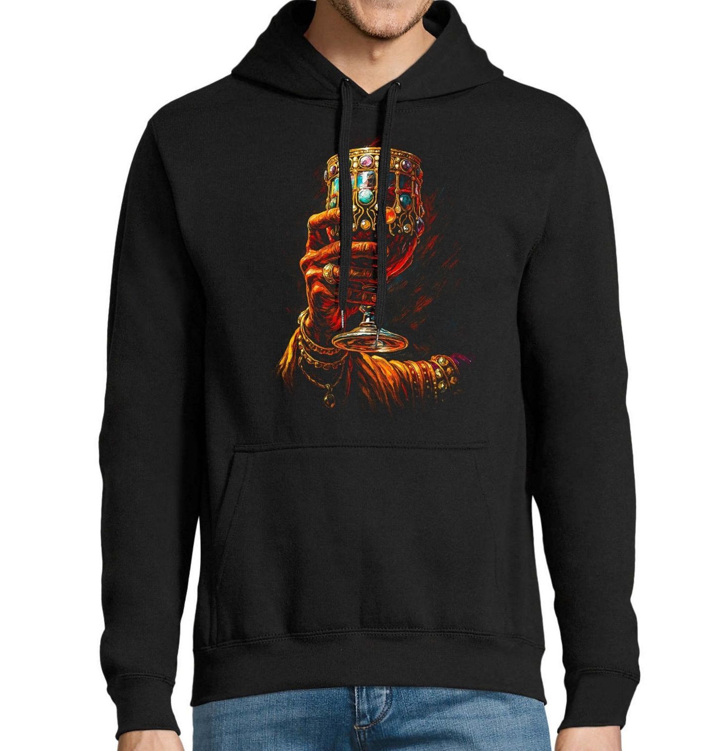 Pánská mikina Zdobený Pohár Na Zdraví! Luxusní a výrazný motiv zachycuje zdobený pohár, který působí jako artefakt plný tajemství, bohatství a skrytých příběhů. Detailní zpracování drahokamů a ornamentů dodává designu královský a mystický nádech. Tento pohár symbolizuje touhu, hojnost i zakázané pokušení. Elegantní ruka, která jej drží, podtrhuje atmosféru moci, luxusu a kontroly.