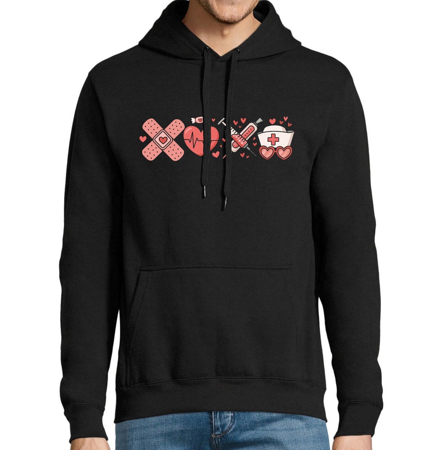 Pánská mikina Zdravotnické Pomůcky. Hravý a zároveň srdečný motiv, který vzdává hold lidem, pro které je zdravotnictví posláním. Ilustrace kombinuje symboly péče, empatie a profesionality – náplast, srdce s pulsem, injekční stříkačku a čepici, kterou nosí doktor i lékař. Každý prvek vyjadřuje lásku k práci a každodenní nasazení pro zdraví druhých.