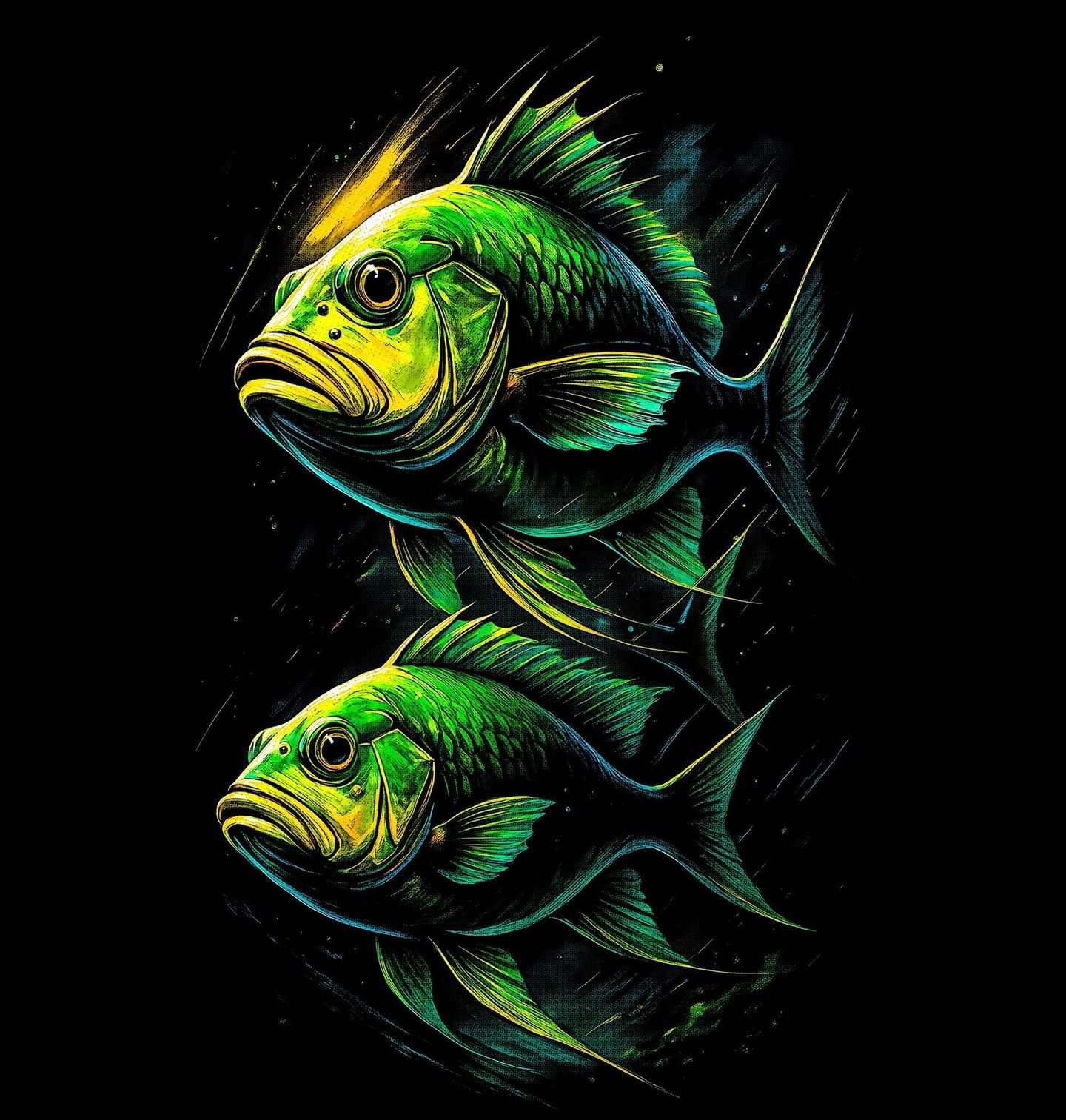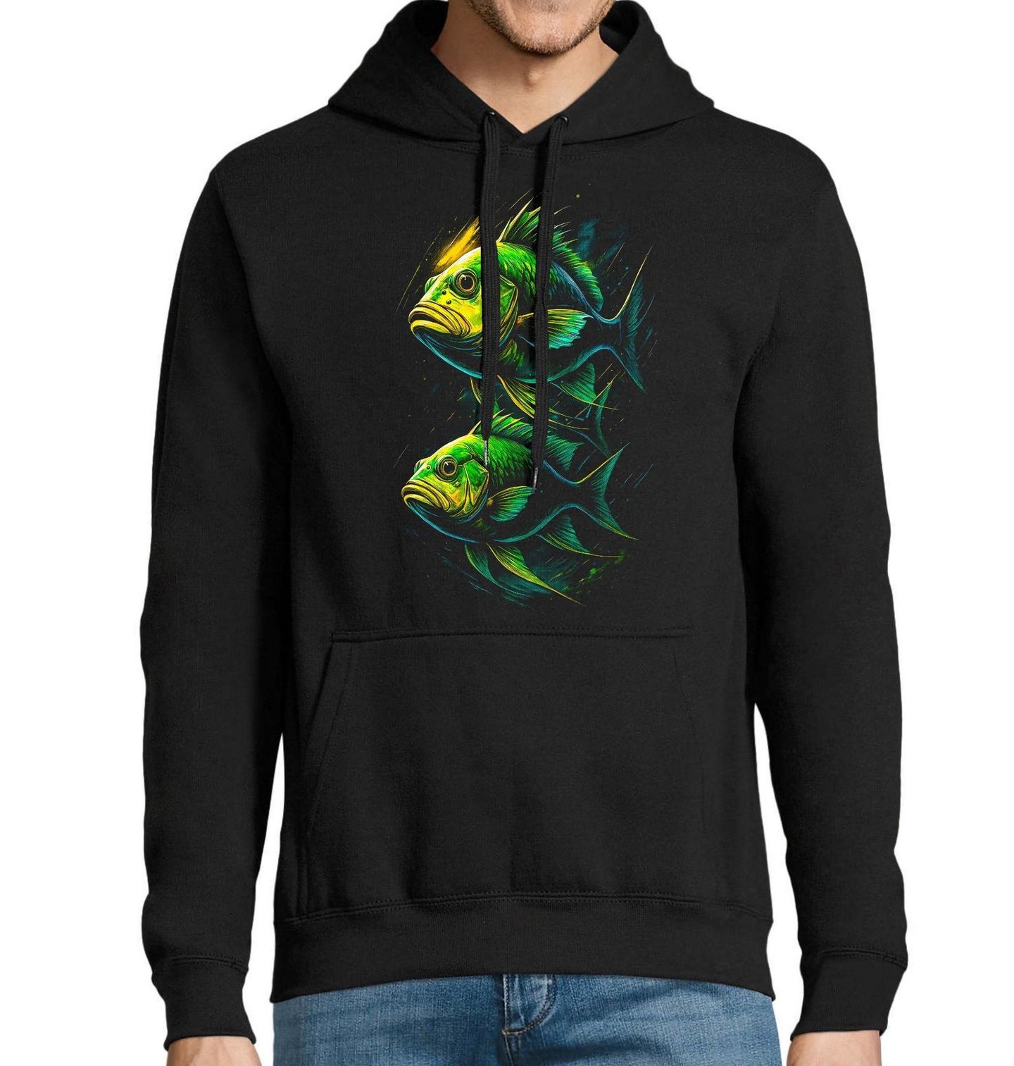 Pánská mikina Zelené Rybky v Páru. Zelené rybky v páru klidně proplouvají průzračnou vodou a vytvářejí vyvážený motiv plný pohybu a ticha. Obraz evokuje atmosféru podmořského světa, který je blízký každému, kdo má vztah k přírodě, vodě a vášni, jakou je rybaření. Tento motiv osloví nejen rybář, ale i všechny, kteří obdivují krásu života pod hladinou.