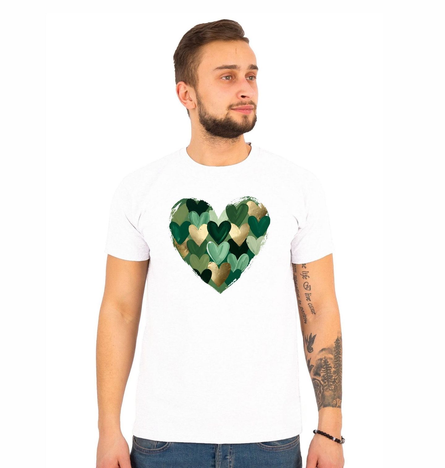 Pánské tričko Zelené Srdce Lásky. Jemný a moderní motiv srdce složený z malovaných tahů v odstínech zelené a zlaté působí klidně, harmonicky a nadčasově. Kombinace přírodních tónů se zlatými akcenty vytváří elegantní design, který symbolizuje rovnováhu, hloubku a emoce.