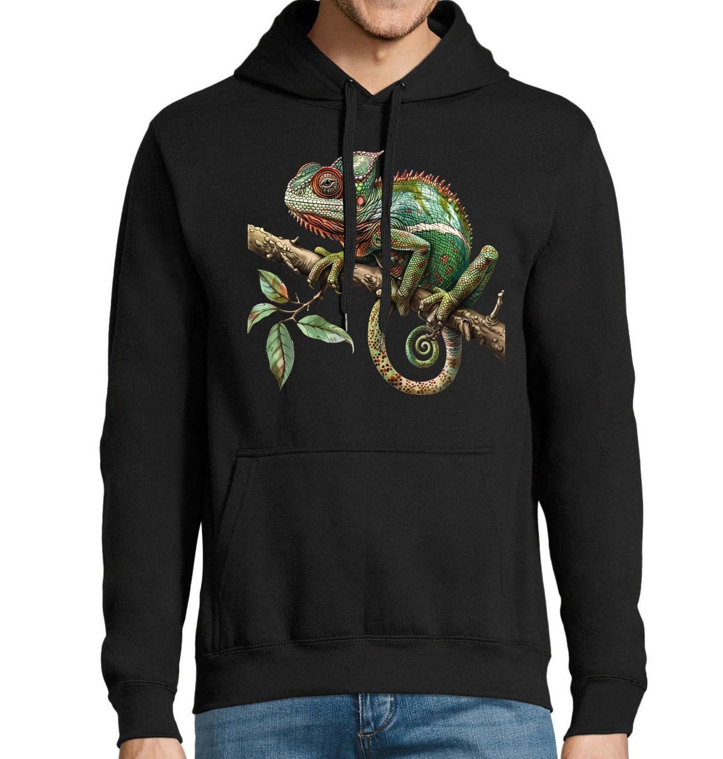 Pánská mikina Zelený Chameleon na Větvi. Realistický motiv zachycuje chameleona, exotický plaz, jak sedí na větvi stromu s typicky stočeným ocasem. Chameleon jako plaz je symbolem přizpůsobivosti, klidu a originality. Tento motiv je ideální volbou pro milovníky přírody, exotických zvířat, teraristiky a originálních designů.
