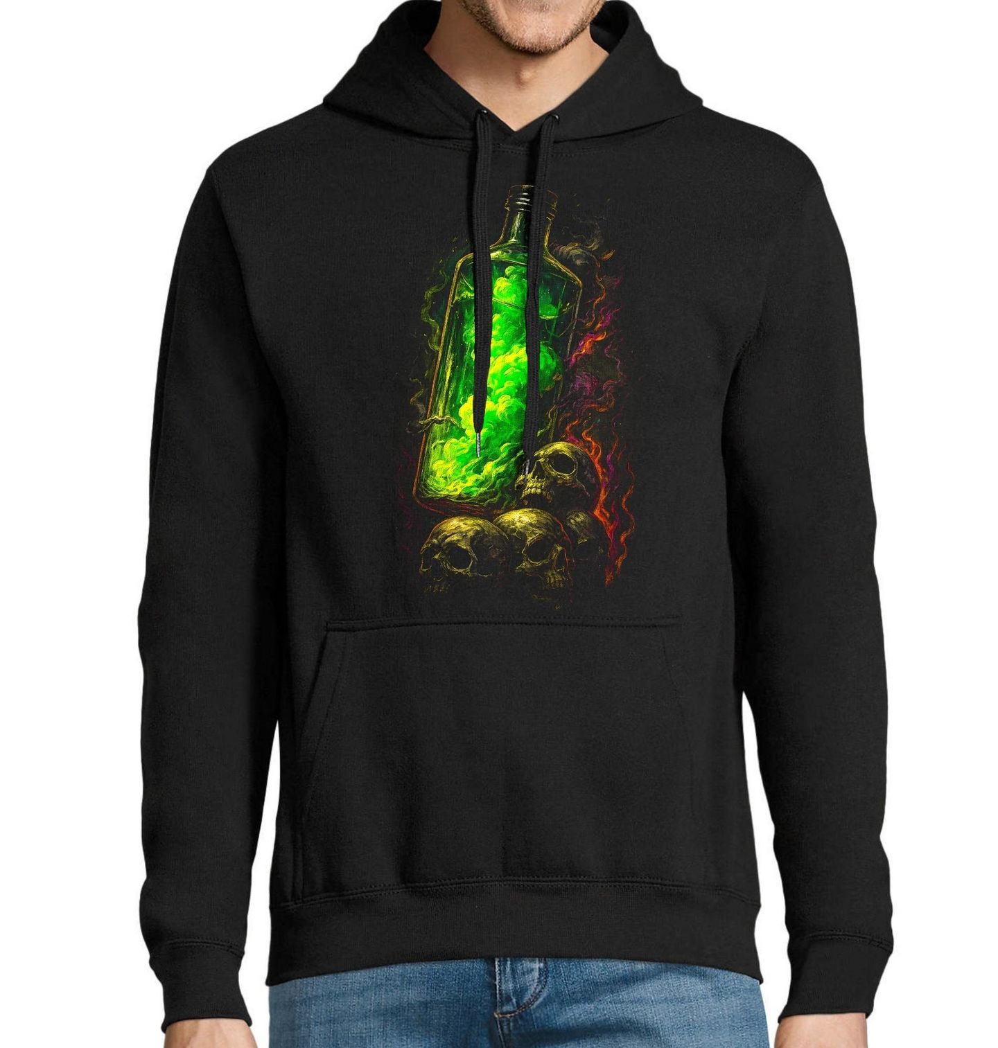 Pánská mikina Zelený Jed. Temný a hypnotizující motiv, ve kterém dominuje zářící zelený jed uzavřený ve skleněné lahvi. Tajemná substance se vznáší uvnitř a vytváří silný vizuální efekt, který okamžitě přitahuje pozornost. Pod lahví leží lebky jako tichá připomínka síly, kterou jed představuje. Jed zde není jen látka – je symbolem moci, destrukce i zakázaného poznání. Ideální motiv pro ty, kteří mají rádi temnou atmosféru a výrazné, provokativní vizuály.