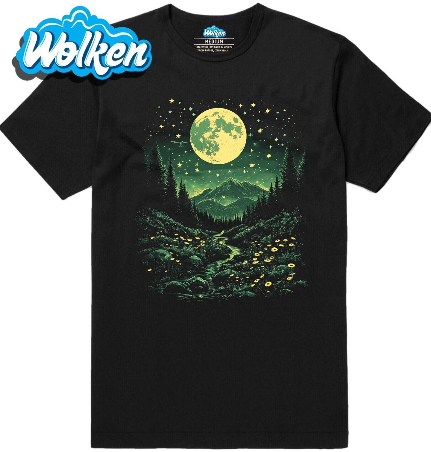Pánské tričko Zelený Měsíc nad Horami. Magický motiv pro milovníky přírody zachycuje klidný noční les, majestátní hory a zářivý měsíc na hvězdné obloze. Tento design osloví každého, kdo má blízko k přírodě, horám a tichu lesa pod světlem měsíce. Ideální dárek pro dobrodruhy, turisty i romantické duše.