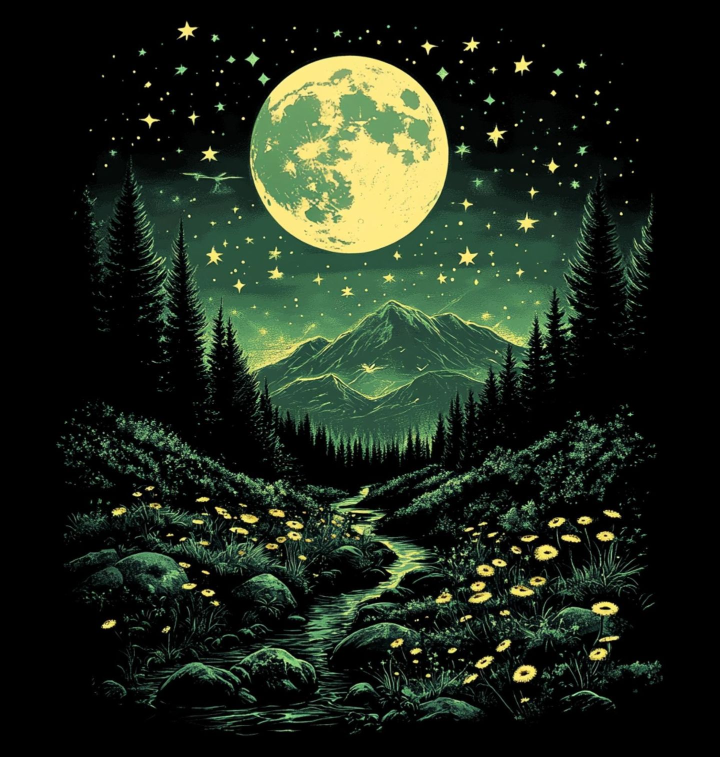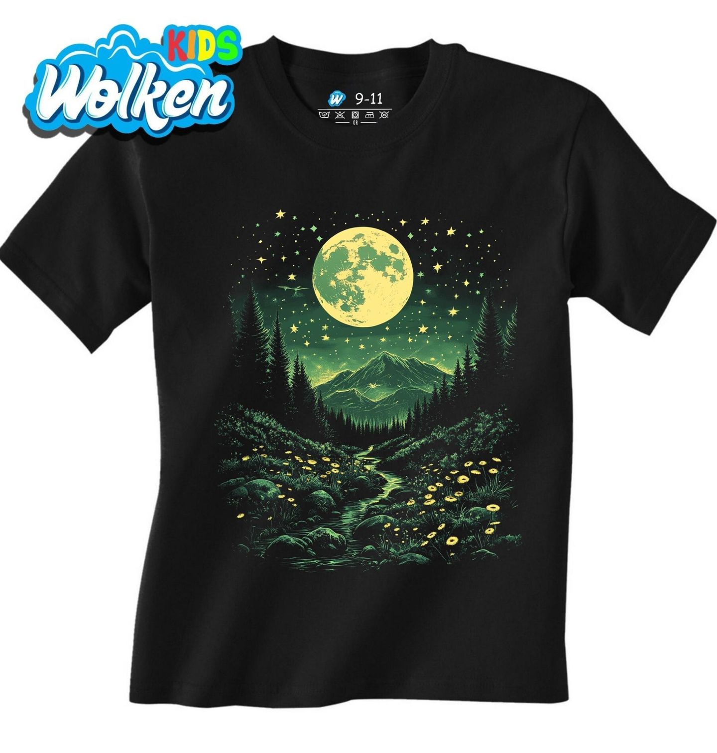 Dětské tričko Zelený Měsíc nad Horami. Magický motiv pro milovníky přírody zachycuje klidný noční les, majestátní hory a zářivý měsíc na hvězdné obloze. Tento design osloví každého, kdo má blízko k přírodě, horám a tichu lesa pod světlem měsíce. Ideální dárek pro dobrodruhy, turisty i romantické duše.