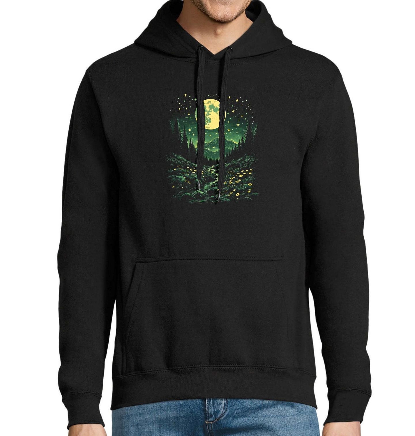 Pánská mikina Zelený Měsíc nad Horami. Magický motiv pro milovníky přírody zachycuje klidný noční les, majestátní hory a zářivý měsíc na hvězdné obloze. Tento design osloví každého, kdo má blízko k přírodě, horám a tichu lesa pod světlem měsíce. Ideální dárek pro dobrodruhy, turisty i romantické duše.