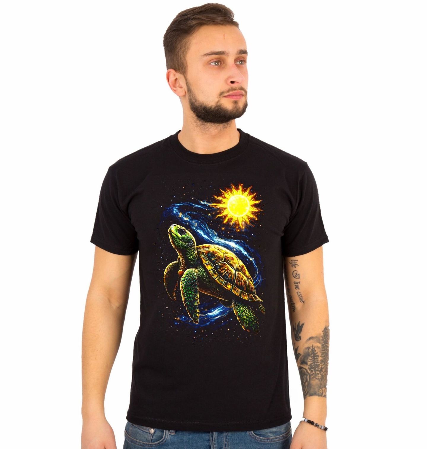 Pánské tričko Želva na Vesmírném Dobrodružství. Unikátní a fascinující motiv, kde želva pluje nekonečným vesmírem obklopená hvězdami a galaxií, zatímco nad ní září jasné slunce. Tento design propojuje klid přírody s nekonečnem vesmíru a vytváří silnou vizuální i symbolickou kombinaci. Želva zde představuje moudrost, trpělivost a vytrvalost, zatímco vesmír symbolizuje nekonečné možnosti a svobodu. Slunce dodává energii, světlo a život, který tento motiv oživuje.