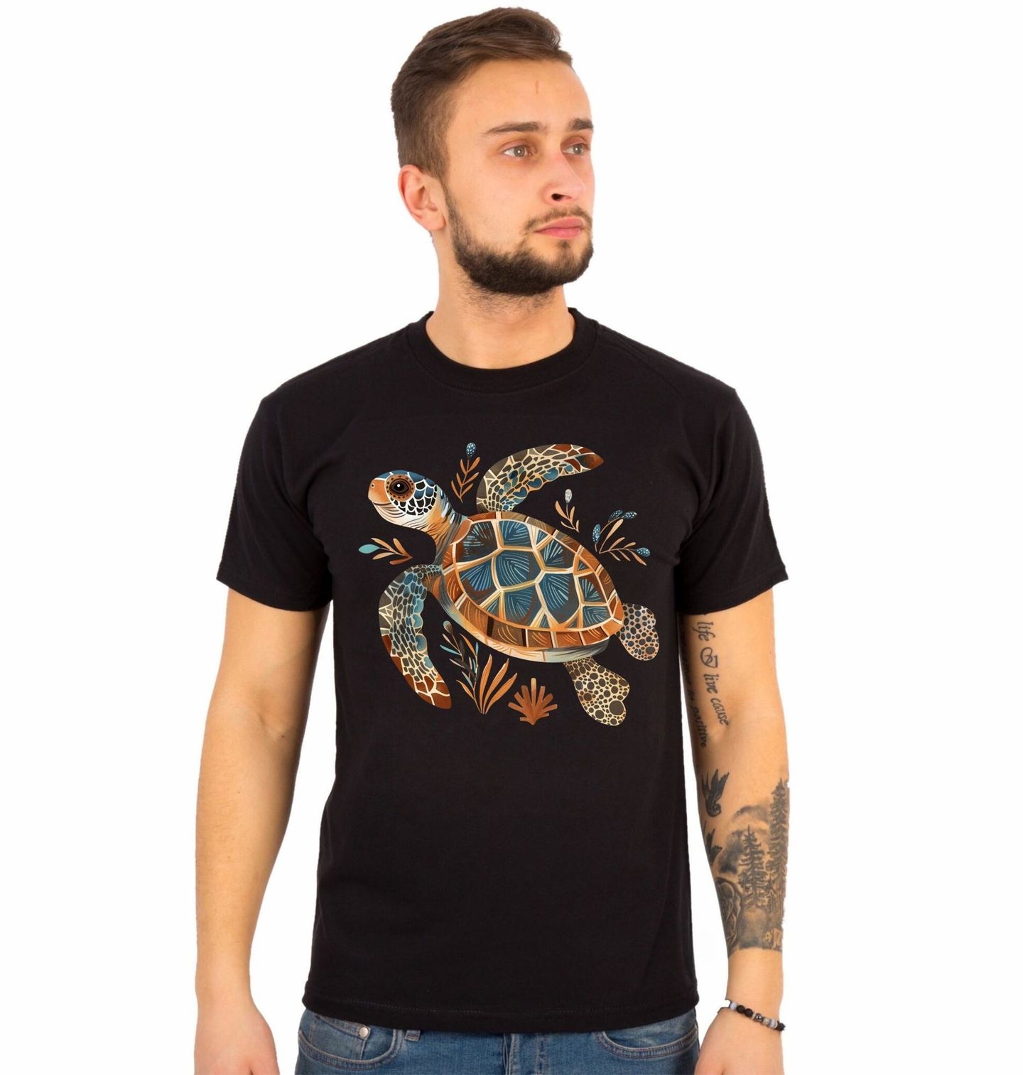 Pánské tričko Želva z Hlubin Moře. Detailní vzory a přírodní barevná paleta vytvářejí harmonický design inspirovaný klidem oceánu a krásou podmořského světa. Motiv želva a moře působí uklidňujícím dojmem a přináší do prostoru pocit svobody, rovnováhy a propojení s přírodou. Ideální volba pro milovníky oceánu, cestování a jedinečných ilustrací s příběhem.
