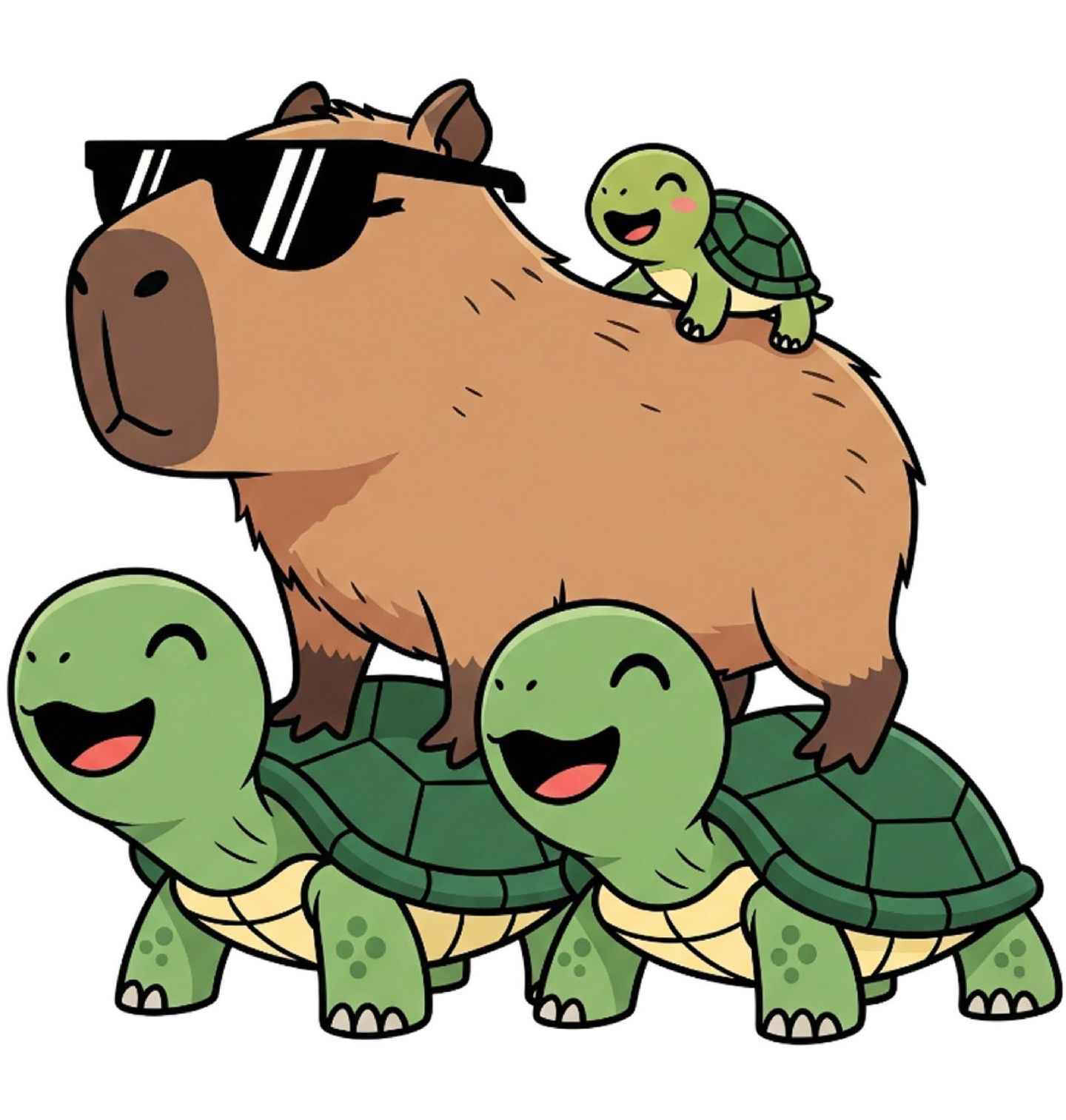 Pánské tričko Želví Taxi pro Kapybaru. Stylový a hravý motiv, kde kapybara – největší hlodavec světa – jede jako boss na partě veselých želv. Kapybara a želva jsou symbolem klidu, pohody a dobré nálady. Ideální pro milovníky zvířat, pohodáře a ty, kteří ví, že život se má brát s nadhledem (nebo s želví taxislužbou!).