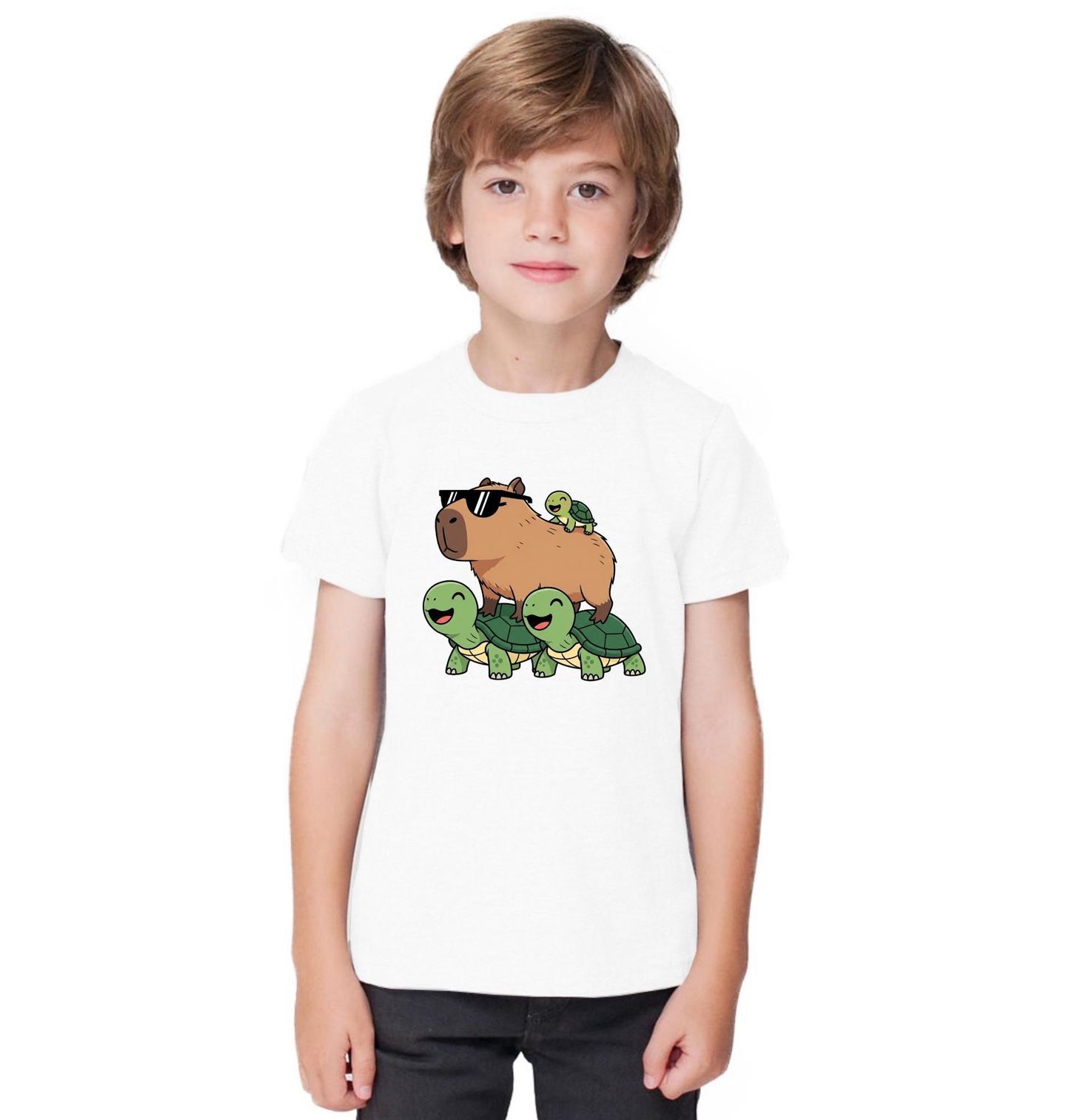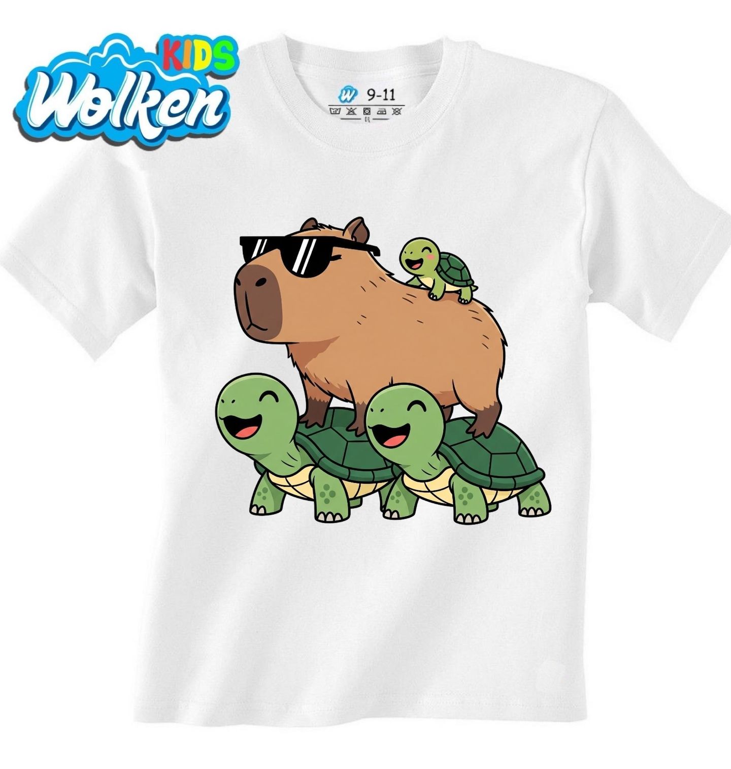 Dětské tričko Želví Taxi pro Kapybaru. Stylový a hravý motiv, kde kapybara – největší hlodavec světa – jede jako boss na partě veselých želv. Kapybara a želva jsou symbolem klidu, pohody a dobré nálady. Ideální pro milovníky zvířat, pohodáře a ty, kteří ví, že život se má brát s nadhledem (nebo s želví taxislužbou!).
