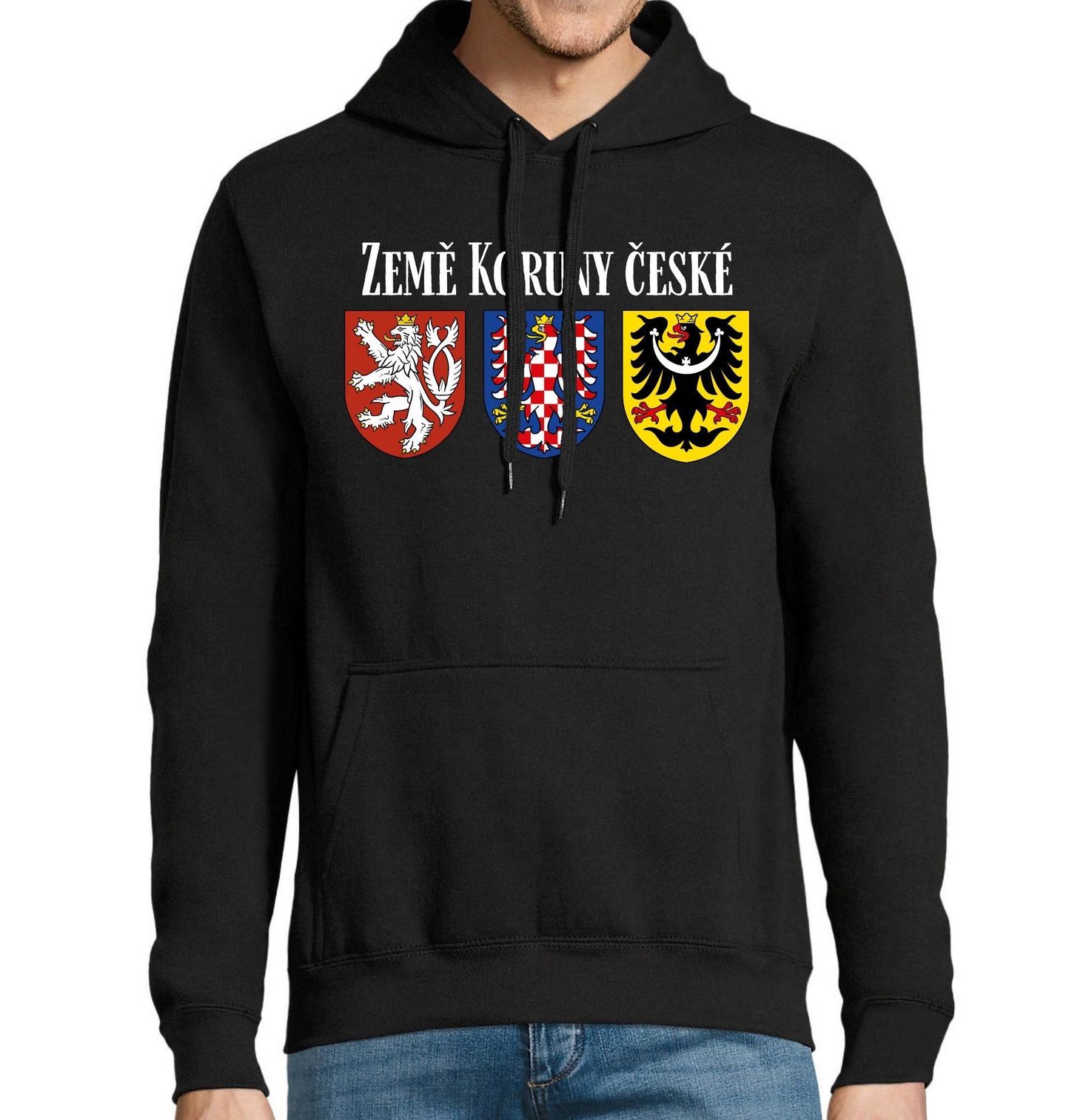 Pánská mikina Země Koruny České. Stylový historický motiv „Země Koruny České“ představuje tradiční heraldické symboly, které tvoří základ identity země Česko. Na designu je zobrazen český lev, moravská orlice a slezská orlice – tři významné znaky, které dohromady symbolizují historické země dnešní České republiky.