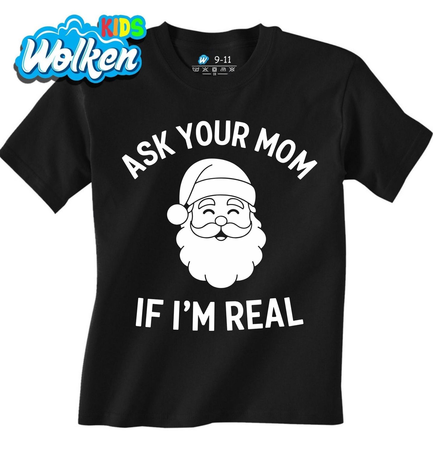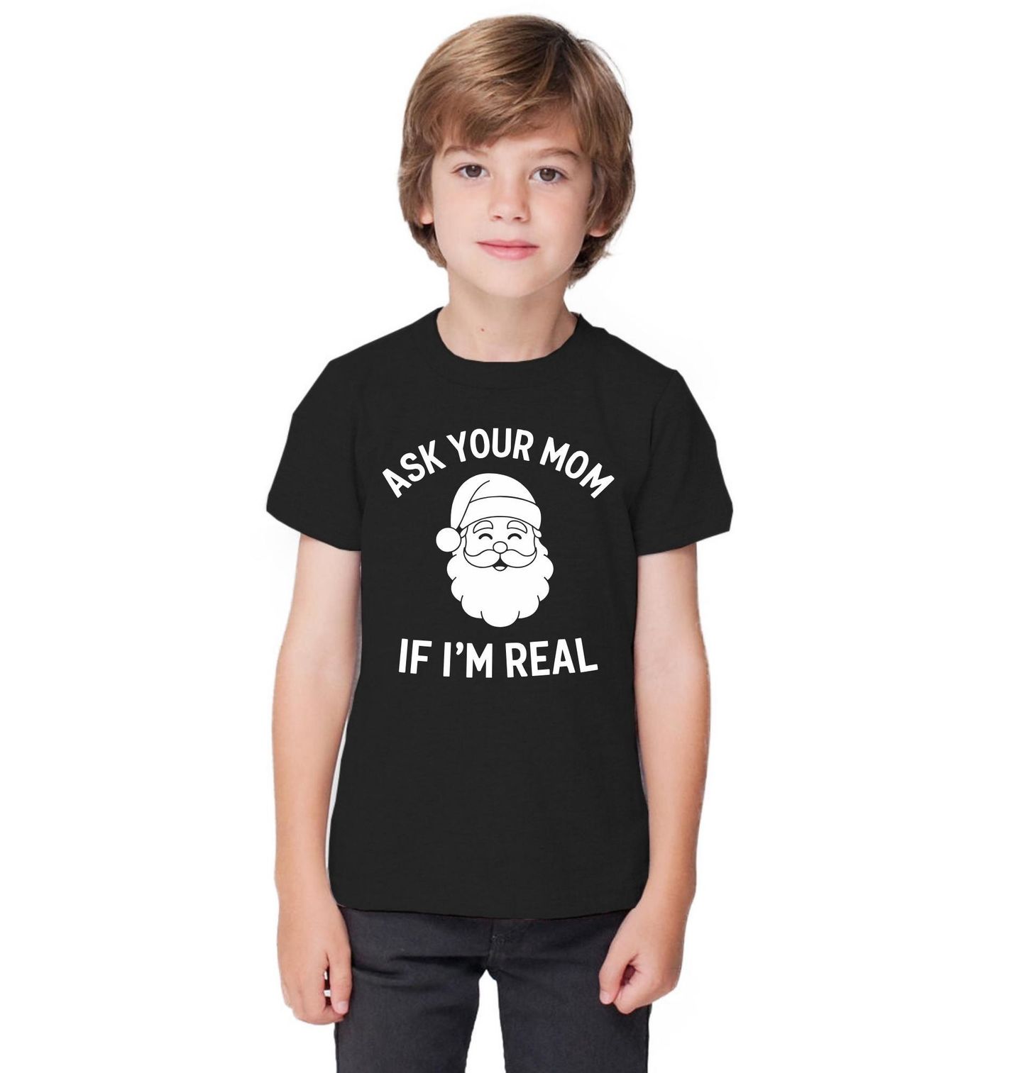 Dětské tričko Zeptej se mámy, jestli jsem skutečný. „Ask your mom if I’m real“ - „Zeptej se mámy, jestli jsem skutečný“ s usměvavým Santou rozesměje každého. Ideální pro všechny, kdo berou Vánoce s nadsázkou. Perfektní dárek pro ty, kteří si rádi dělají legraci ze svátečního tajemství.