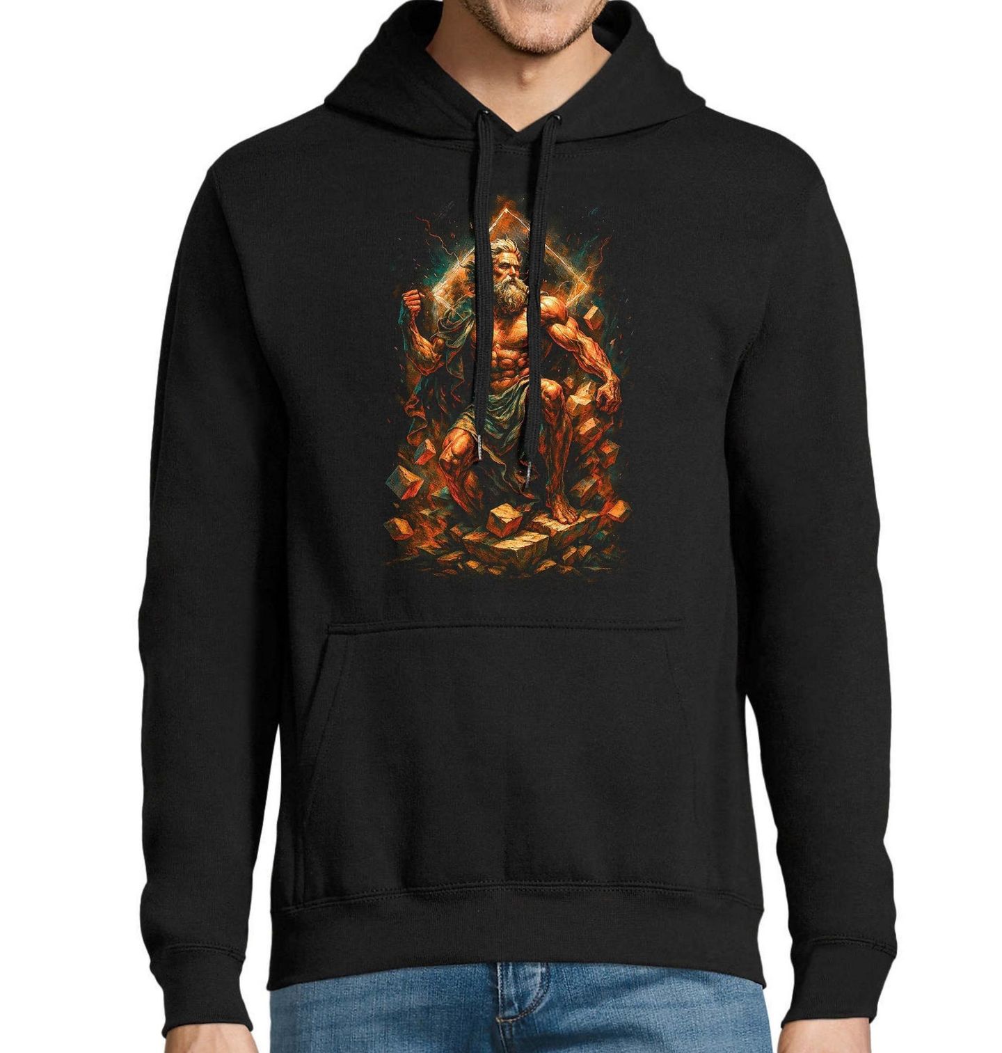 Pánská mikina Zeus Hněv Olympu. Zeus je v řecké mytologii vládcem nebes, pánem hromu a králem bohů na Olympu. Je symbolem autority, spravedlnosti a nezkrotné přírodní energie. Jeho přítomnost vždy znamená rozhodnutí, sílu a osud. S mohutnou postavou, napjatými svaly a energií praskající kolem jeho těla působí jako zosobnění absolutní moci. Geometrické tvary a elektrizující aura za jeho zády symbolizují božskou sílu, která přesahuje svět smrtelníků.