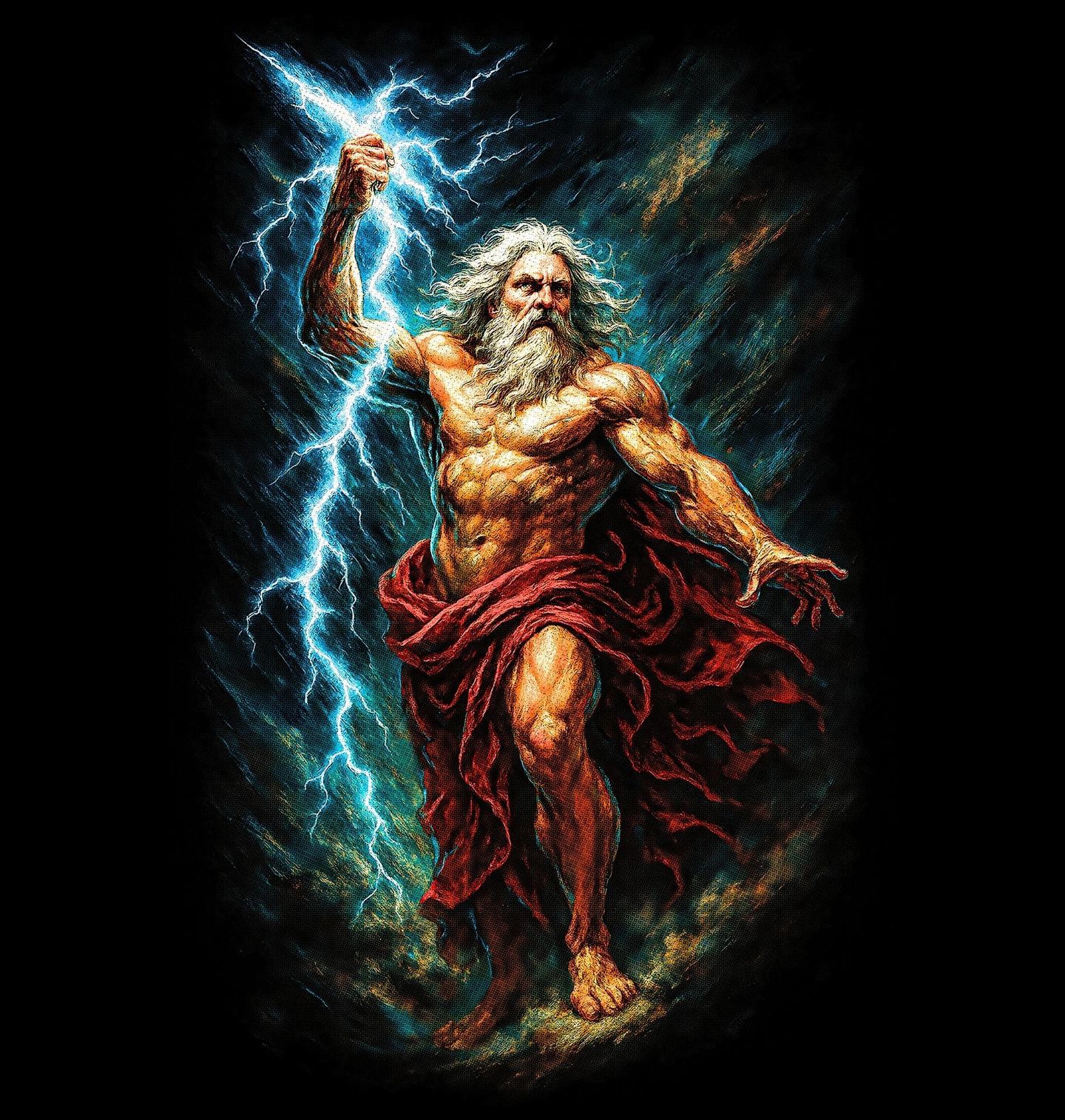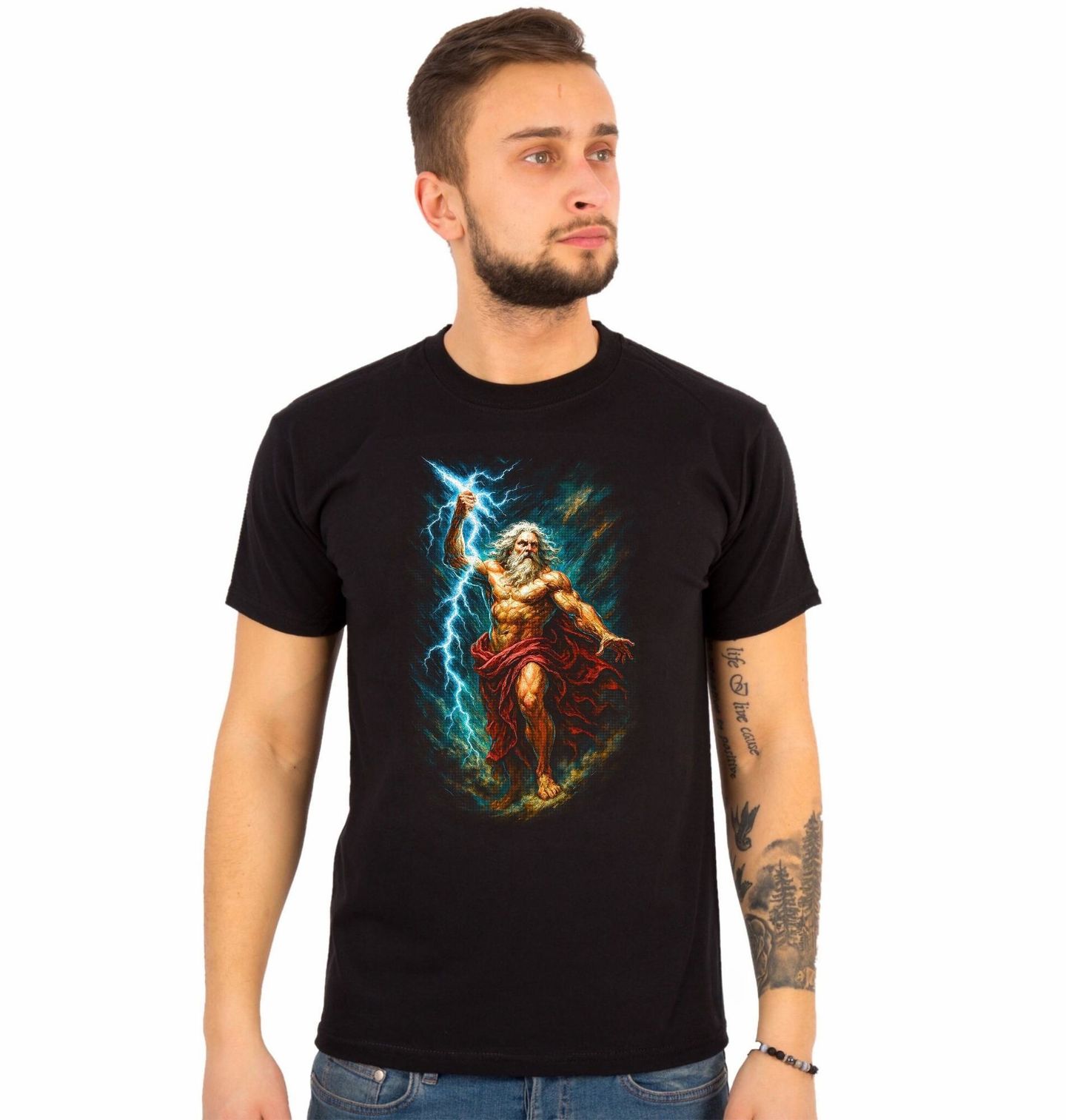 Pánské tričko Zeus Nejvyšší z Bohů. Zeus je nejvyšší z bohů řecké mytologie. Zeus je v řecké mytologii nejvyšším bohem, vládcem Olympu a pánem nebe, hromu a spravedlnosti. Je symbolem autority, síly a božského řádu. Jeho blesk představuje trest i ochranu, ničivou sílu i spravedlivé rozhodnutí.