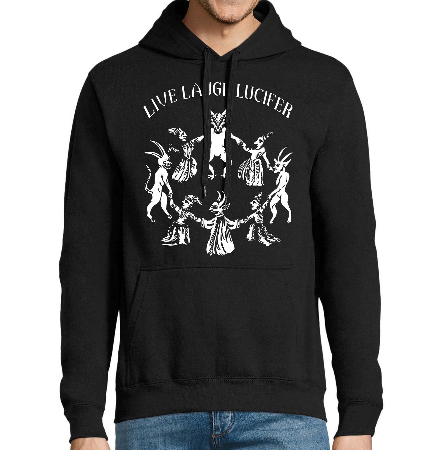Pánská mikina Žij Směj se Lucifer Live Laugh Lucifer. Tento provokativní design je temnou parodií na známé motto „Live Laugh Love“. Nápis „Live Laugh Lucifer“ lze přeložit jako „Žij, směj se, Lucifer“, zatímco ilustrace démonických postav v kruhu v čele s Bafometem vytváří výraznou gotickou atmosféru. Motiv osloví fanoušky dark humoru, hororu a alternativní estetiky.