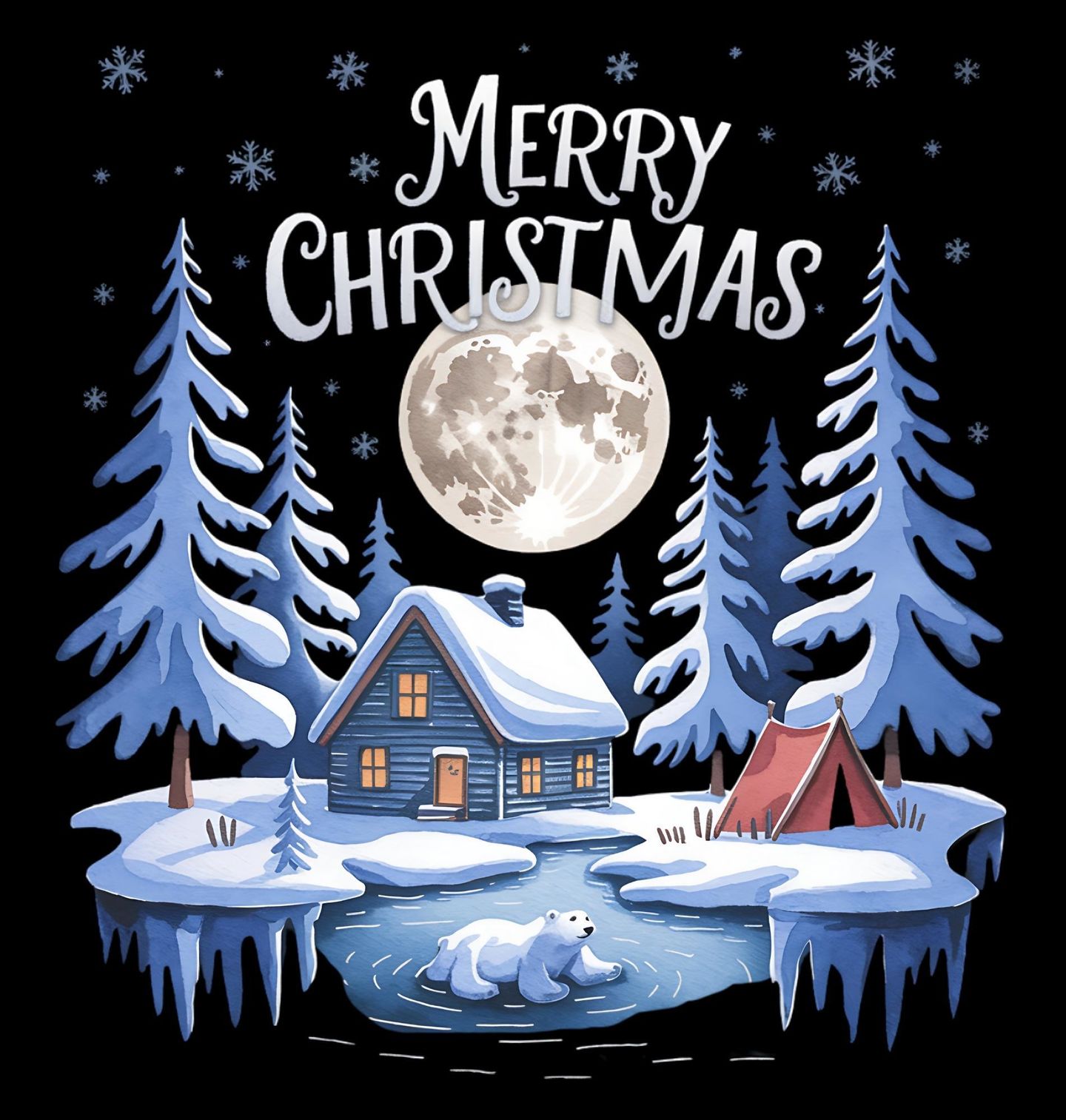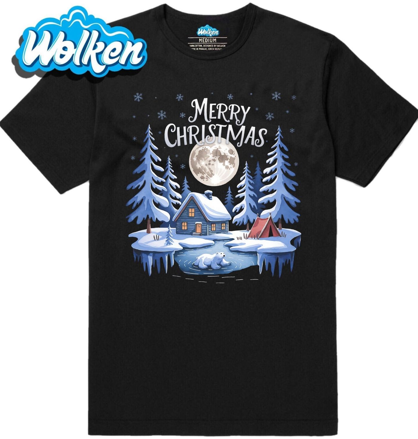 Pánské tričko Zimní chata o Vánocích. Objevte kouzlo přírody s tímto nádherným motivem, který vám přinese opravdové pohádkové Vánoce. Design zobrazuje zimní krajinu se zasněženou chatou u lesa, stanem, měsícem a roztomilým ledním medvědem na zamrzlém jezeře. Merry Christmas!