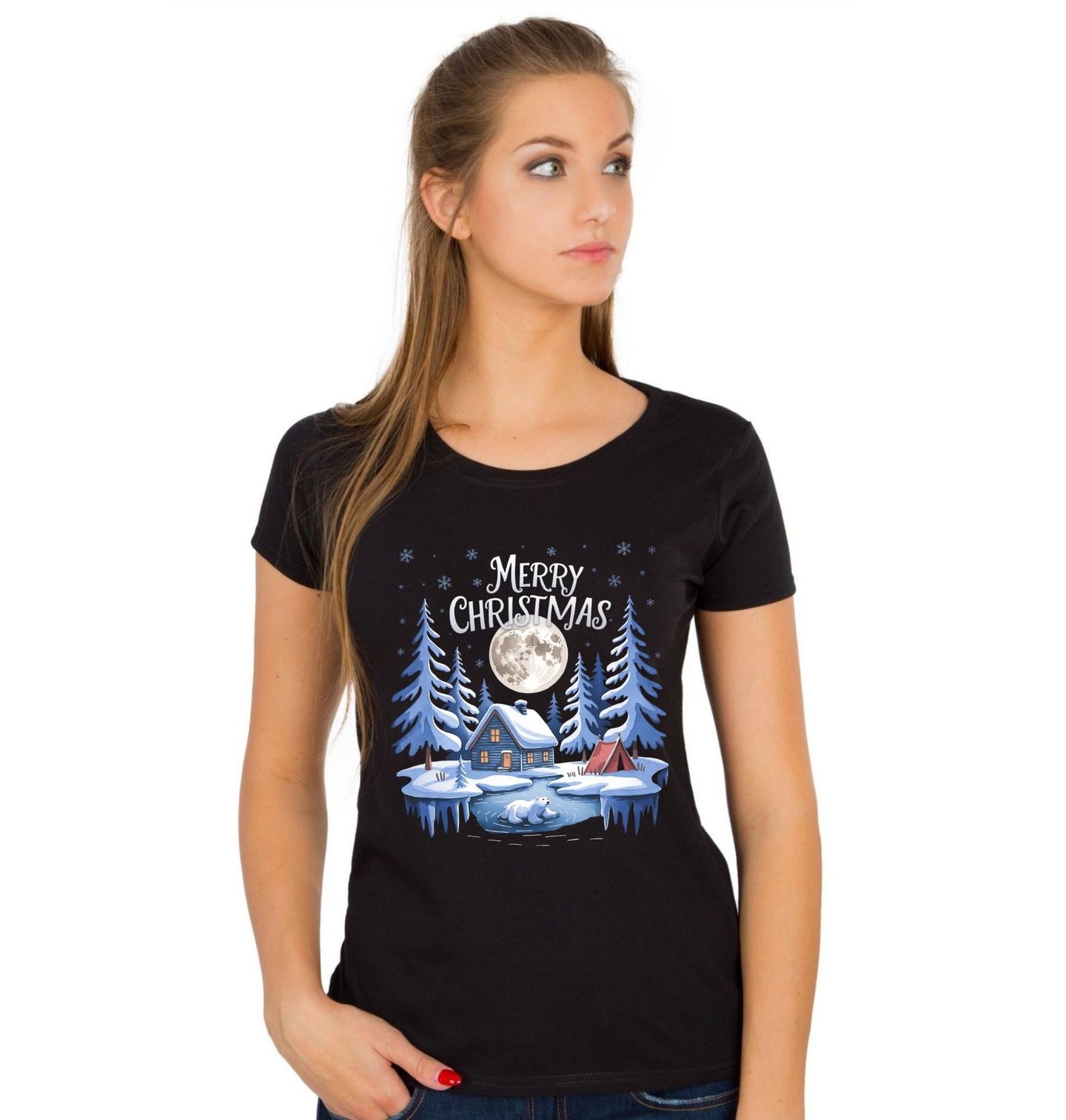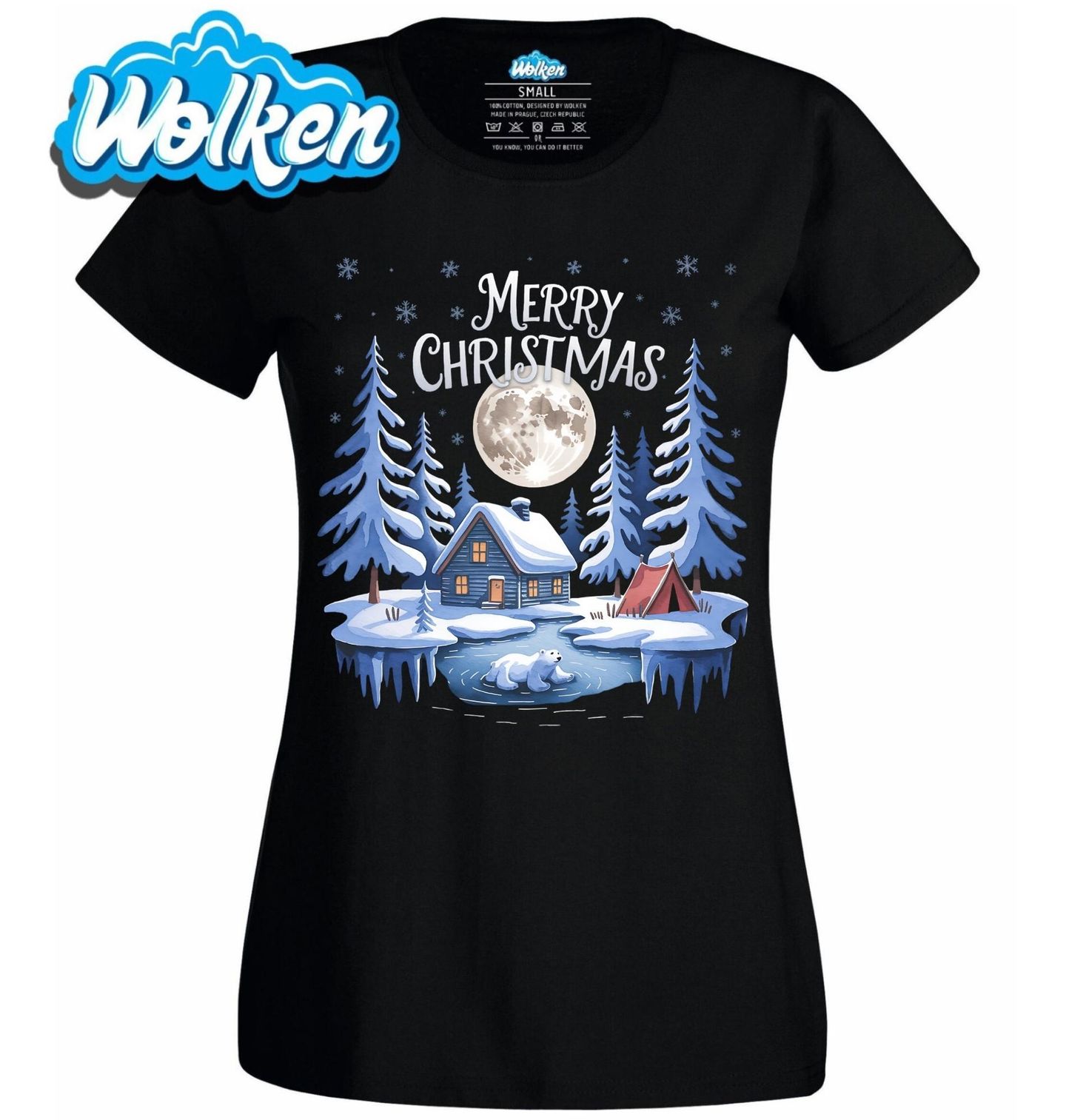 Dámské tričko Zimní chata o Vánocích. Objevte kouzlo přírody s tímto nádherným motivem, který vám přinese opravdové pohádkové Vánoce. Design zobrazuje zimní krajinu se zasněženou chatou u lesa, stanem, měsícem a roztomilým ledním medvědem na zamrzlém jezeře. Merry Christmas!