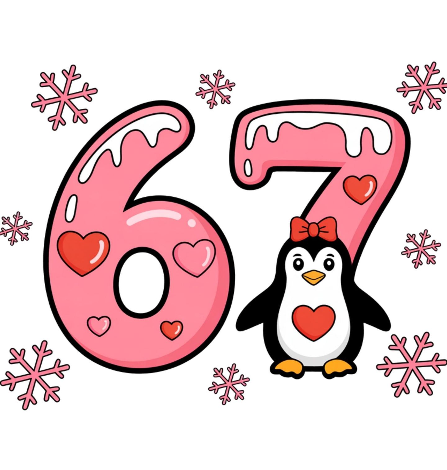 Pánské tričko Zimní Tučňák 67 Six Seven Meme. Roztomilý zimní motiv 67, který potěší všechny milovníky tučňáků a kawaii stylu! Číslo 67 je sladce růžové, ozdobené srdíčky a ledovým efektem, kolem poletují vločky a vedle stojí usměvavý tučňák s mašličkou a srdíčkem na bříšku. Ideální pro fanoušky roztomilých kreslených motivů a hravých meme designů.