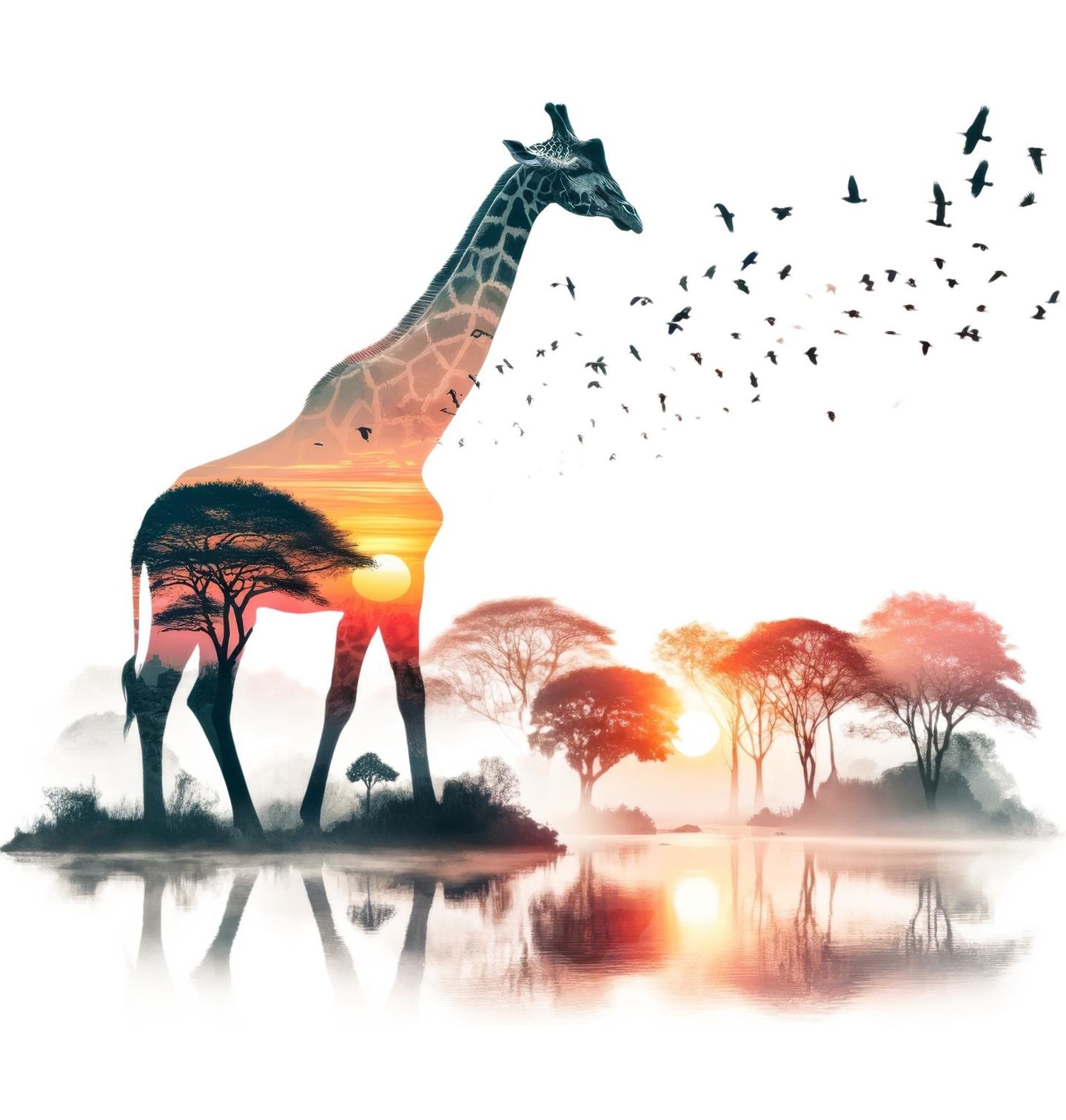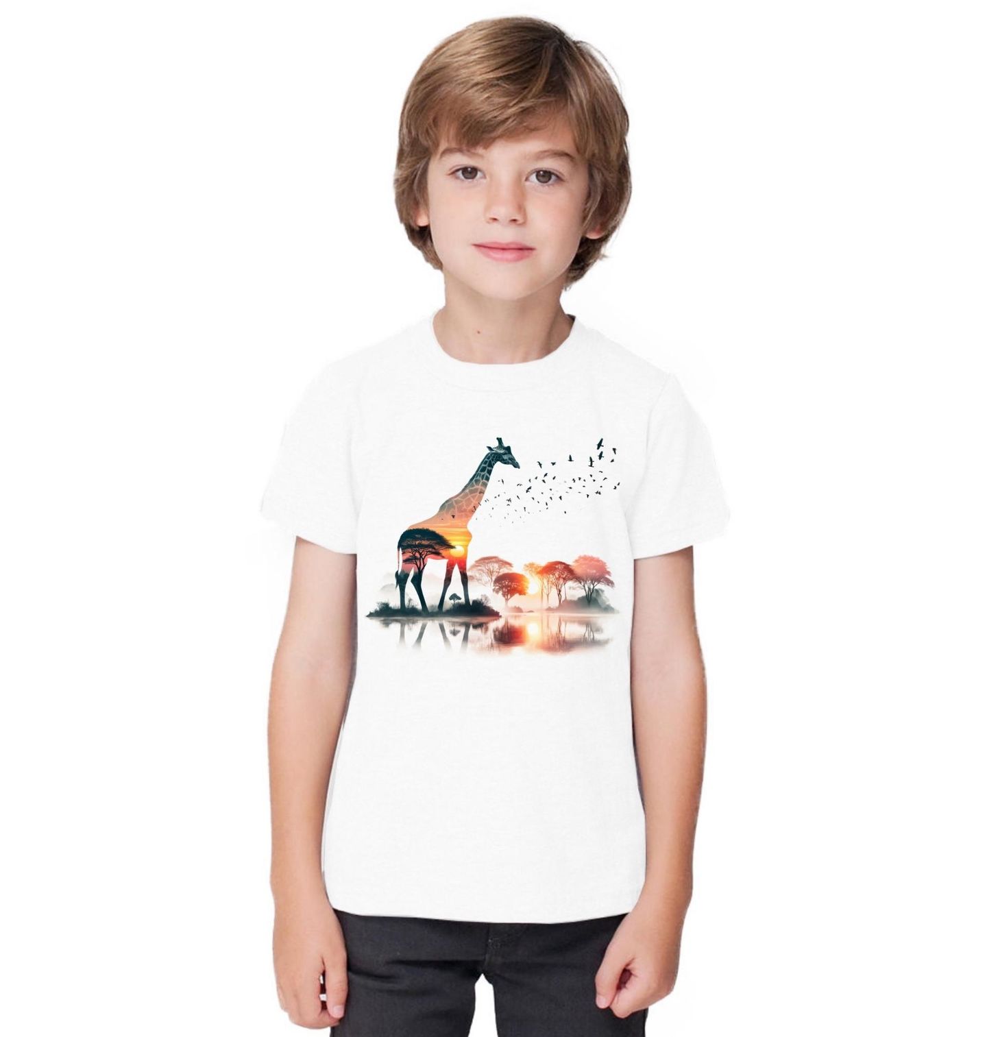 Dětské tričko Žirafa v Savaně. Umělecký motiv žirafy, jejíž tělo je propojeno s krajinou savany při západu slunce. Stromy, voda a jemná mlha vytvářejí klidnou atmosféru. Ptáci odlétající ze siluety dodávají obrazu pohyb.