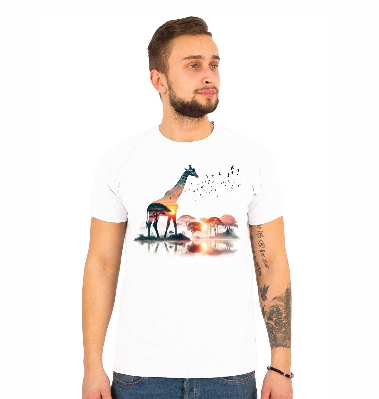 Pánské tričko Žirafa v Savaně. Umělecký motiv žirafy, jejíž tělo je propojeno s krajinou savany při západu slunce. Stromy, voda a jemná mlha vytvářejí klidnou atmosféru. Ptáci odlétající ze siluety dodávají obrazu pohyb.